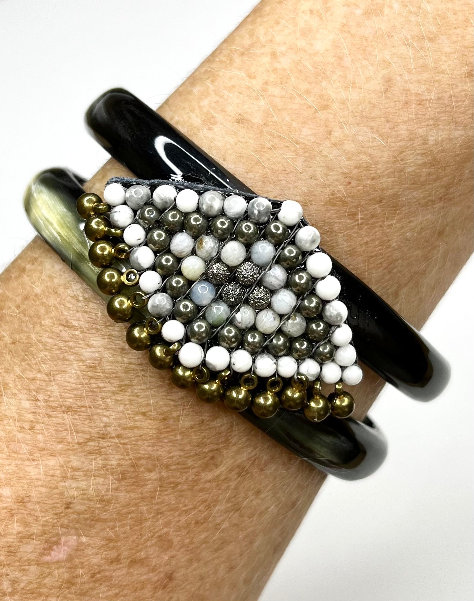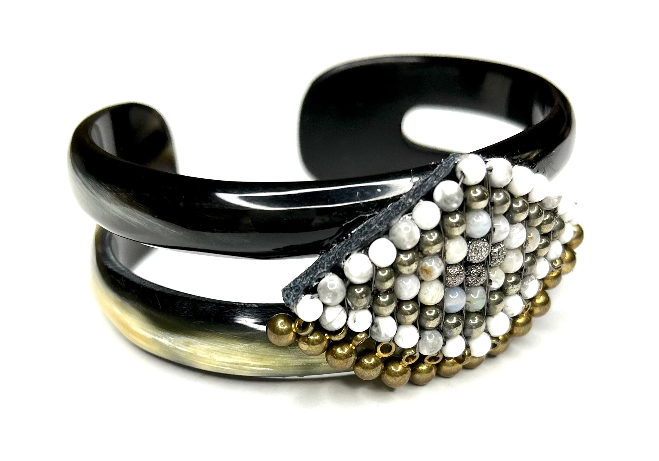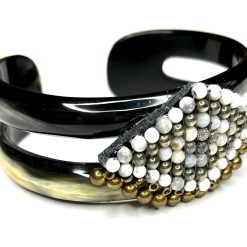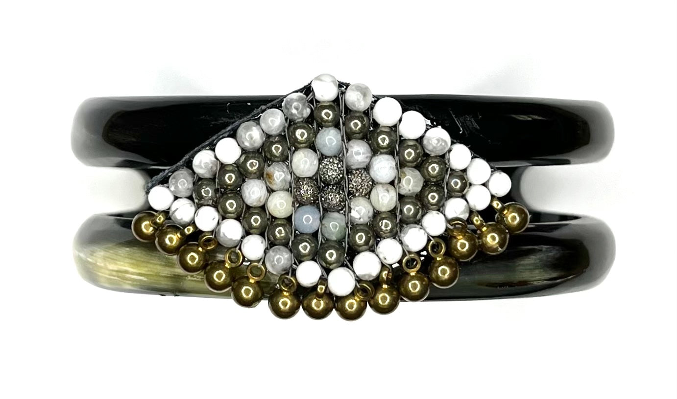 Looking for a little Boho flair? Here is the answer to your dreams! Hand woven beading embellished with tiny brass bead drops embellishes this stunning black and tan horn bracelet. Enjoy the compliments from day to evening!