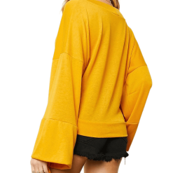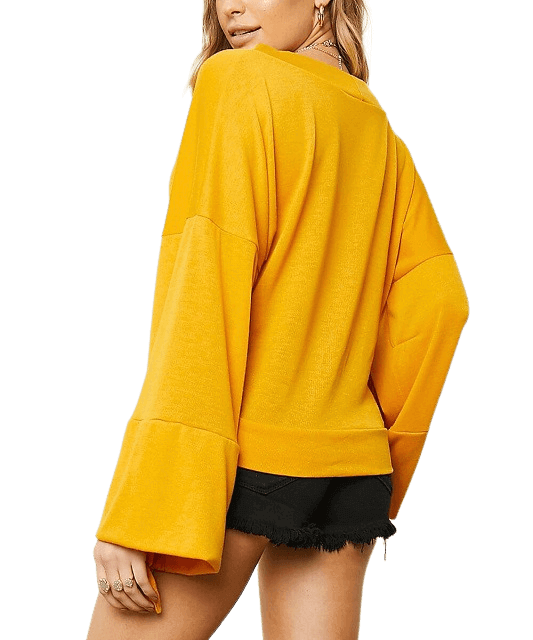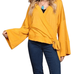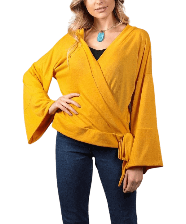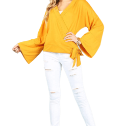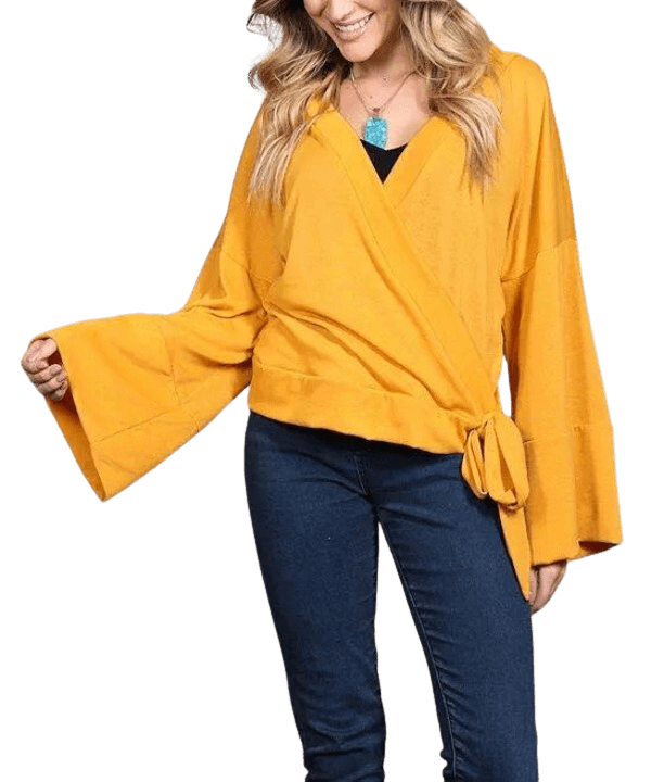 Bring out your sunny-but-sexy side with this solid yellow wrap top, featuring belled sleeves, a V-neckline, and a side waist tie. We think it would look fantastic with a pair of distressed white skinny jeans and nude espadrilles.