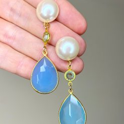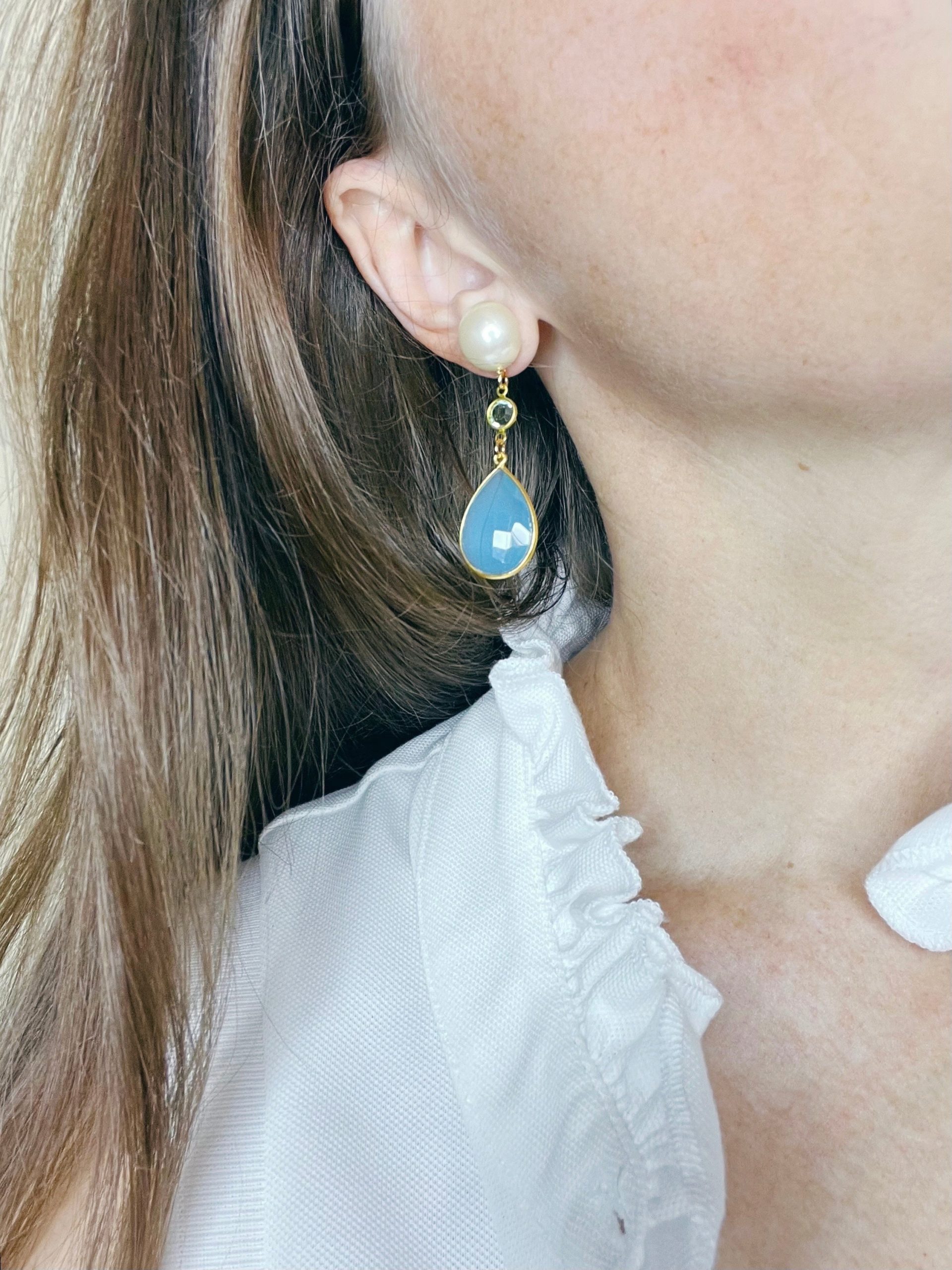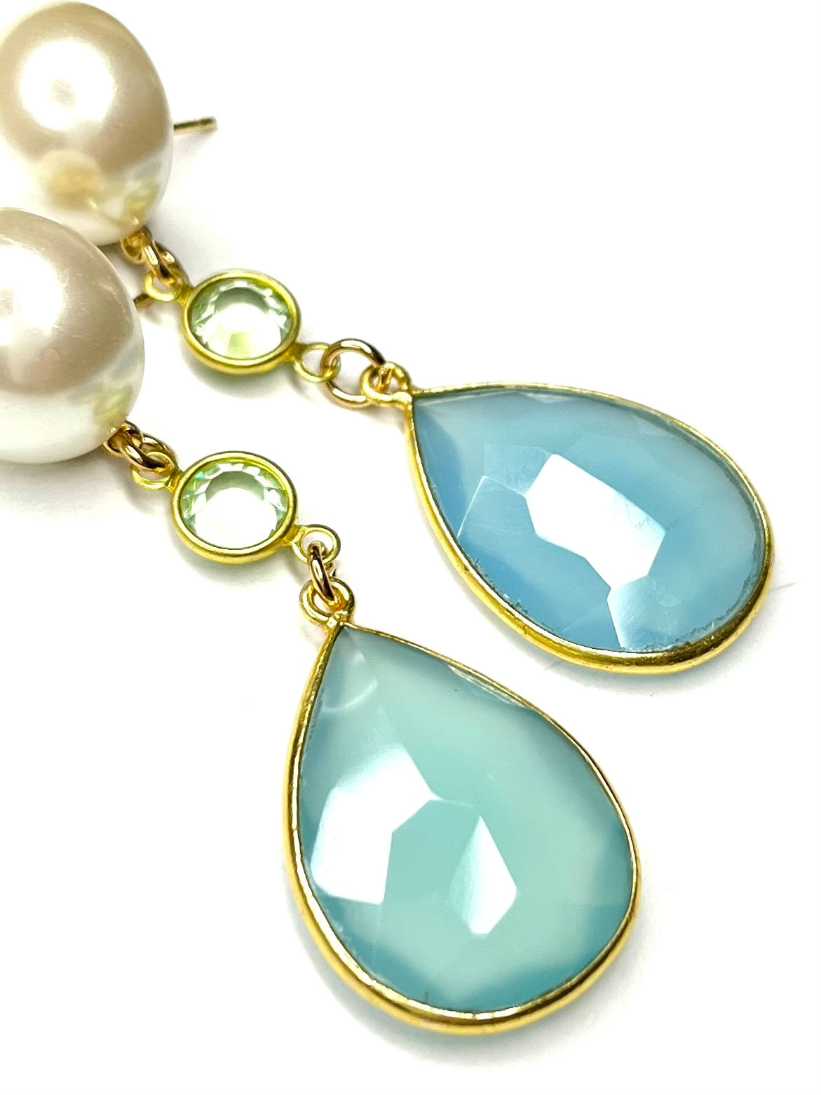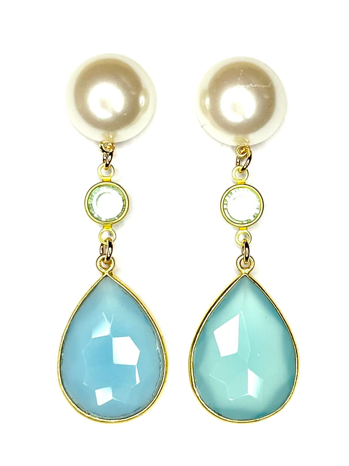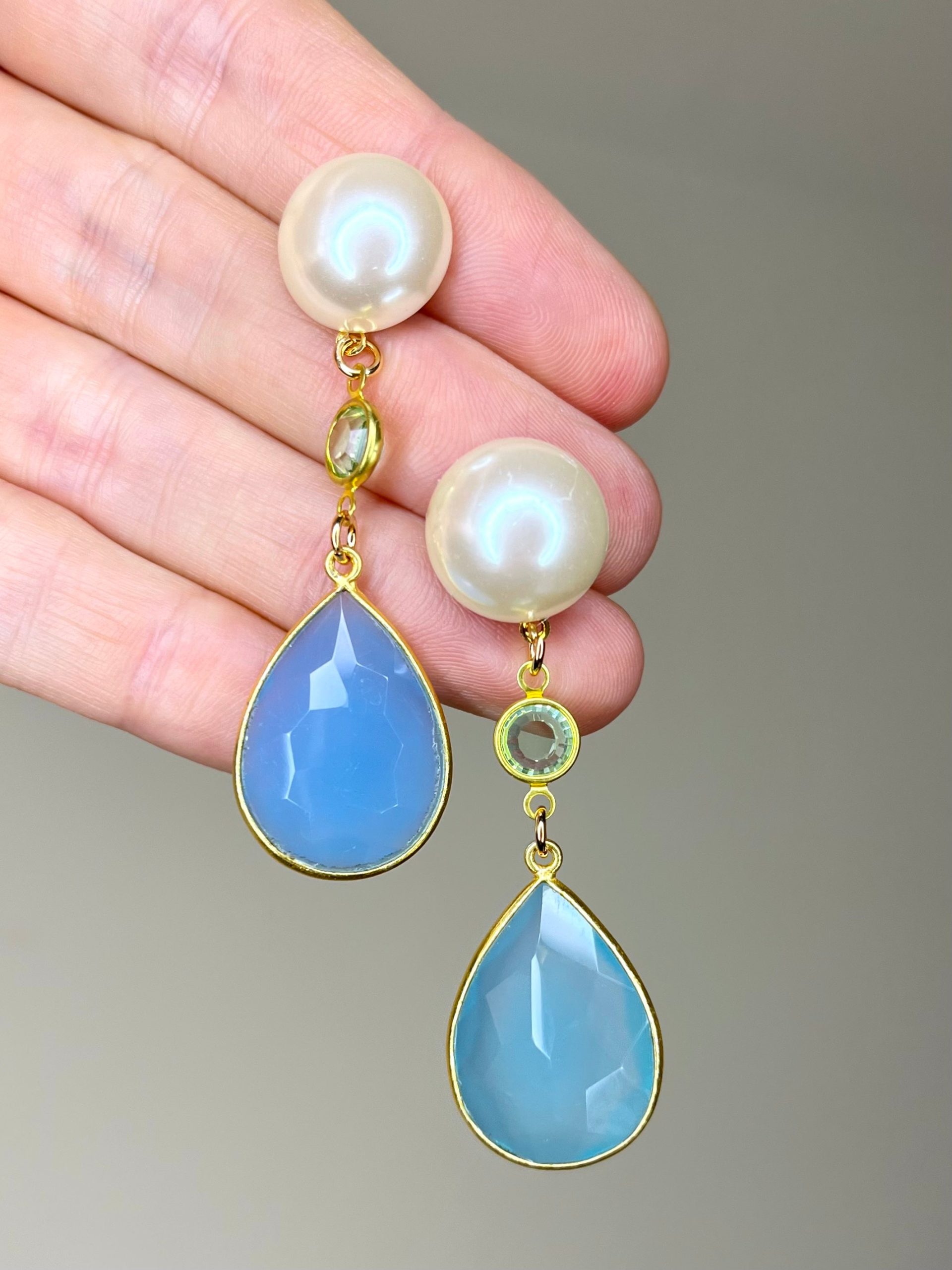 - Dangle Gemstone Earrings-?blue chalcedony steals the show when paired with a pearl cabochon post and tiny pale green crystal connector
