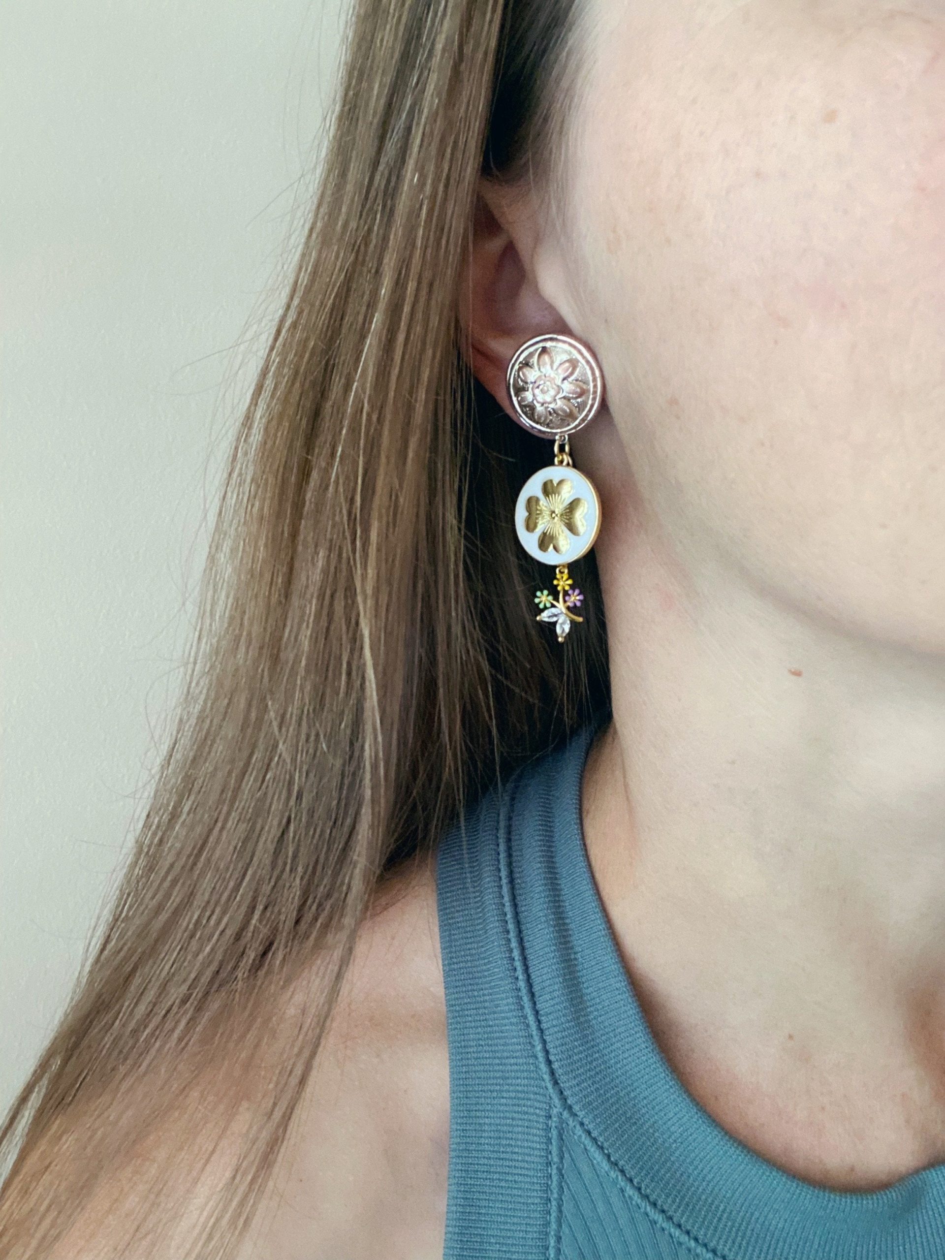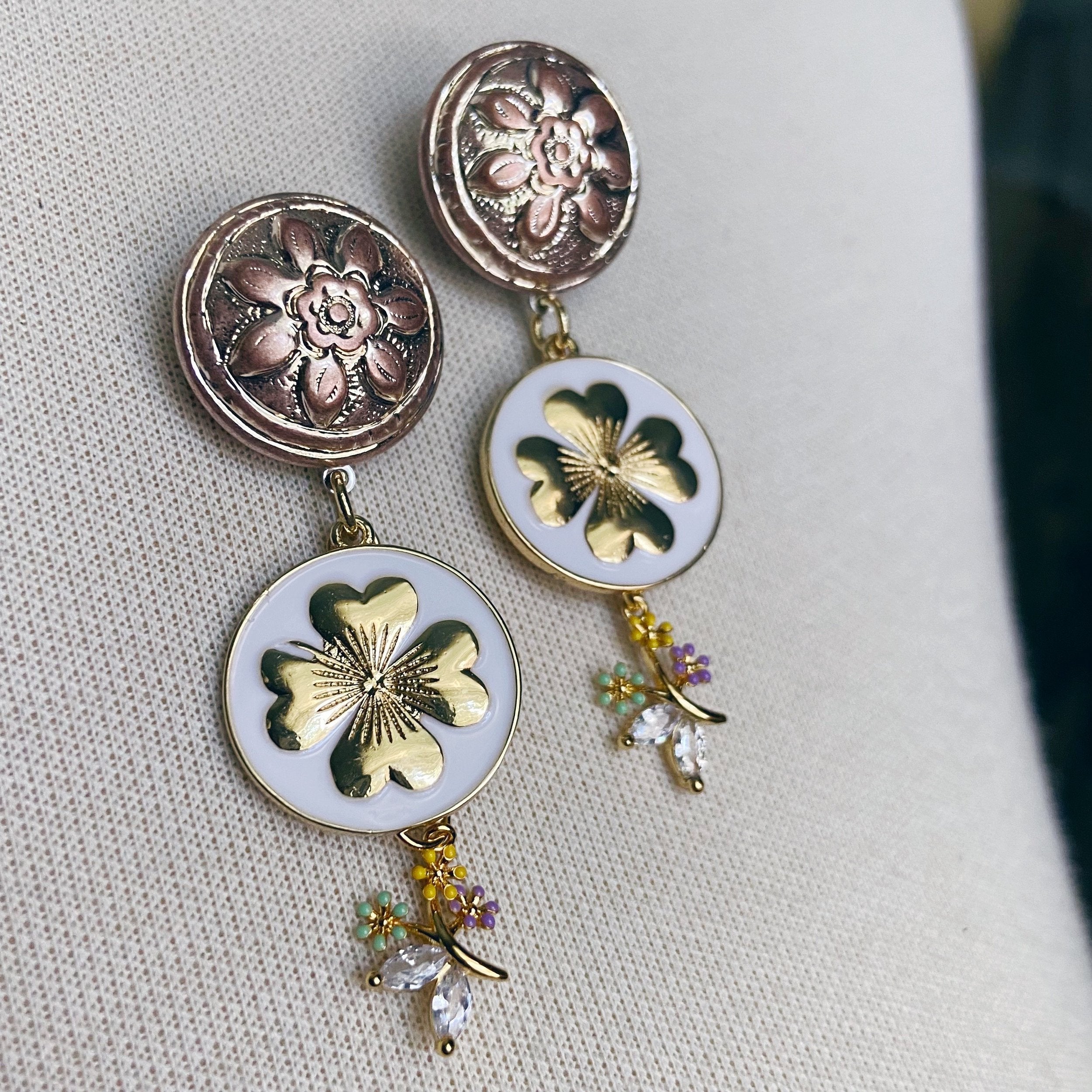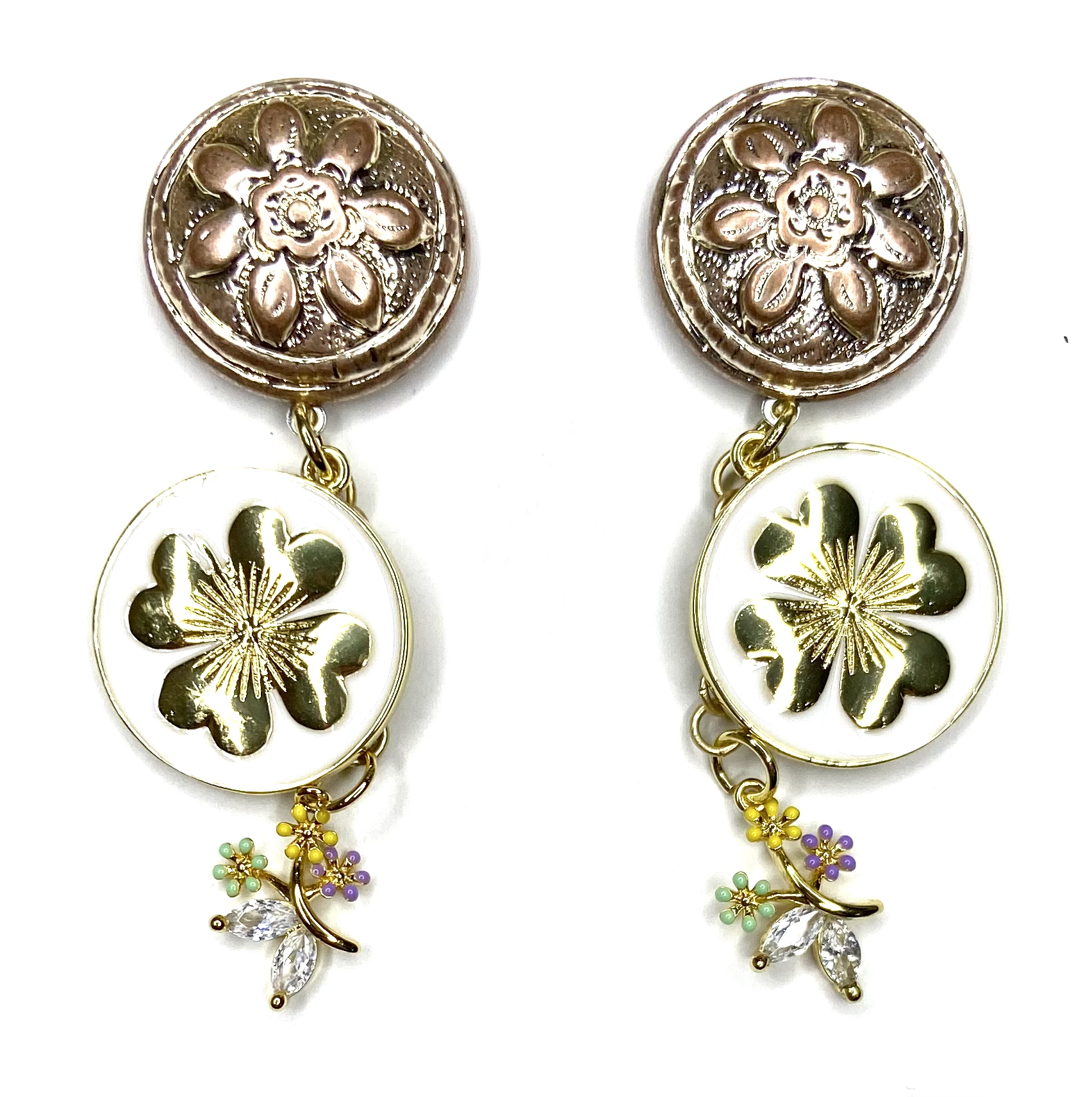 These eye catching statement earrings consist of etched flower posts, white enamel and gold plated charms, and multi colored flowered drops.