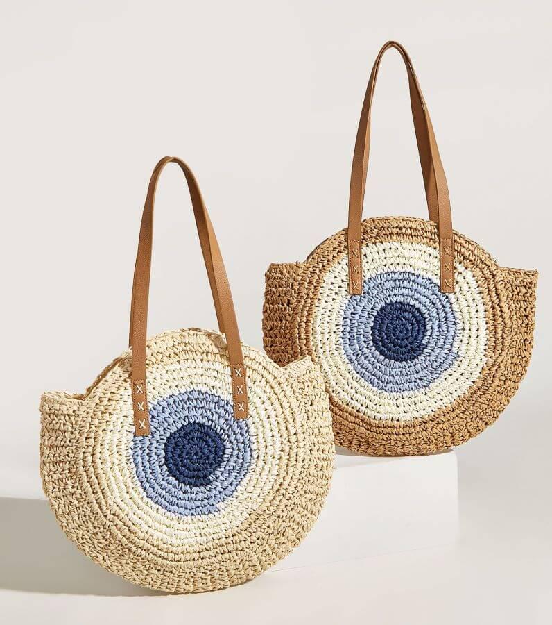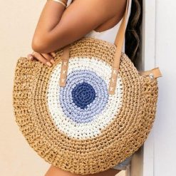 Our Evil Eye Straw Tote Bag – a stylish and eye-catching accessory that will elevate your summer style. This Circular Contrast Straw Tote Bag with Leather Straps is a perfect blend of fashion and functionality, designed to be your go-to bag for any occasion.