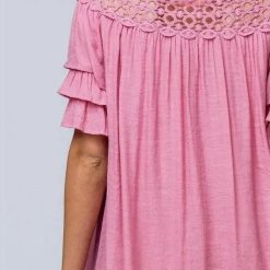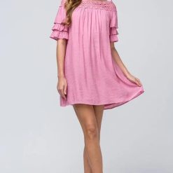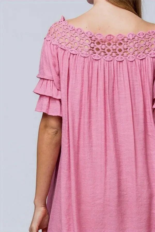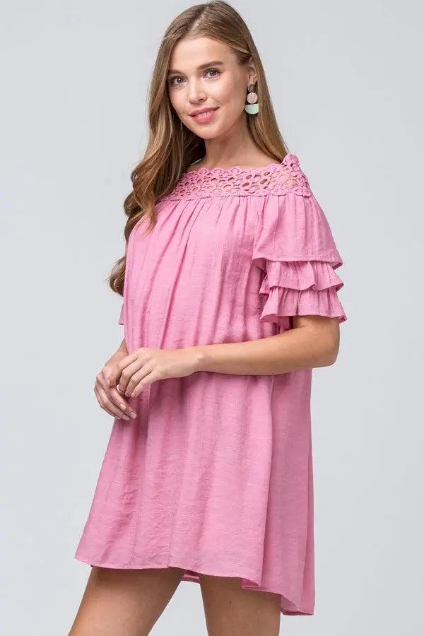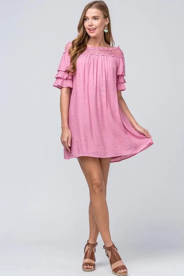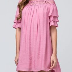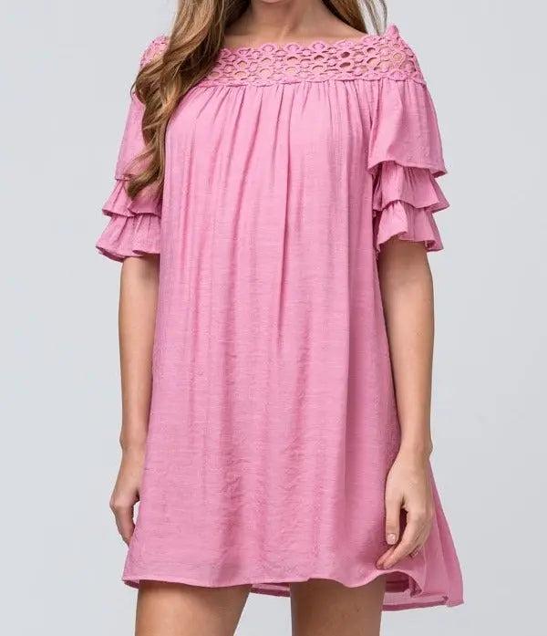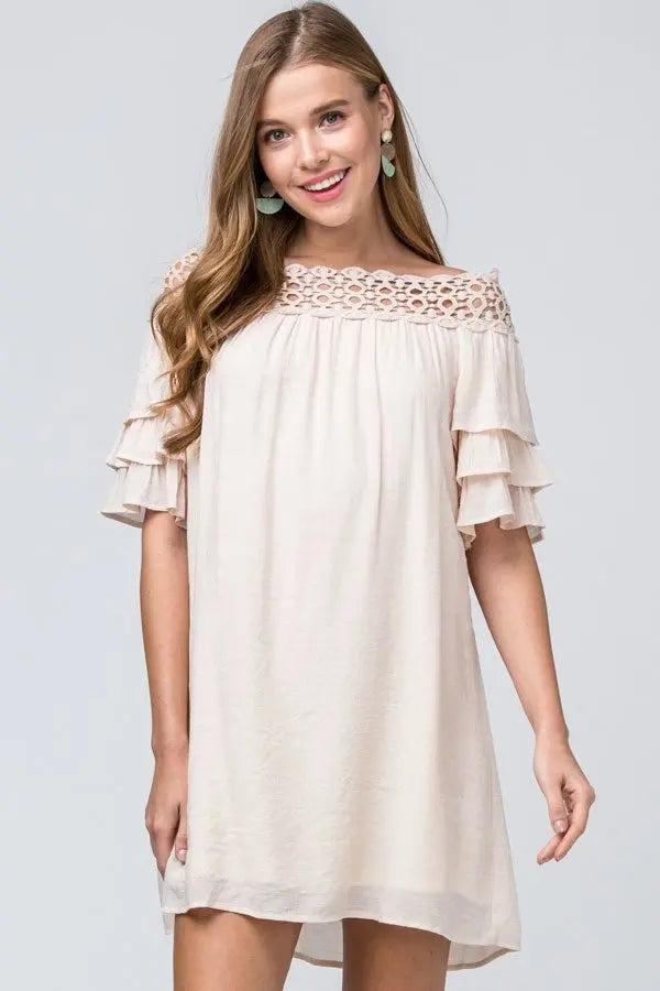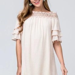 Tea-Time Fashion… This flirty lace-detailed dress is ideal for a girls’ lunch, bridal shower, graduation, or a summer night date! This dress, which falls just above the knee, is ideal for any summer day! Slight off-the-shoulder dress with crochet lace detail at the neckline and ruffled sleeves.