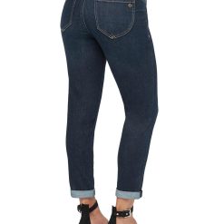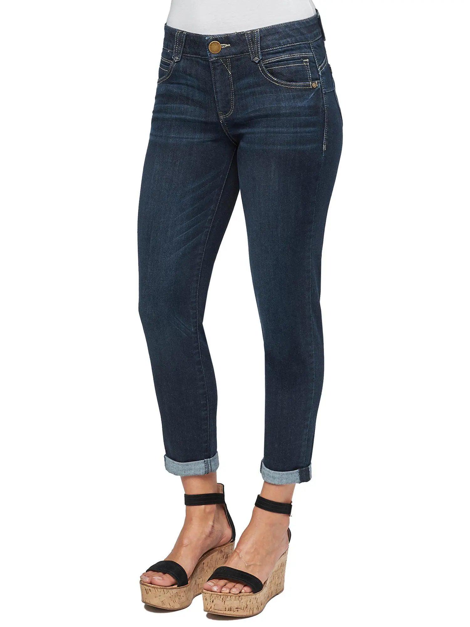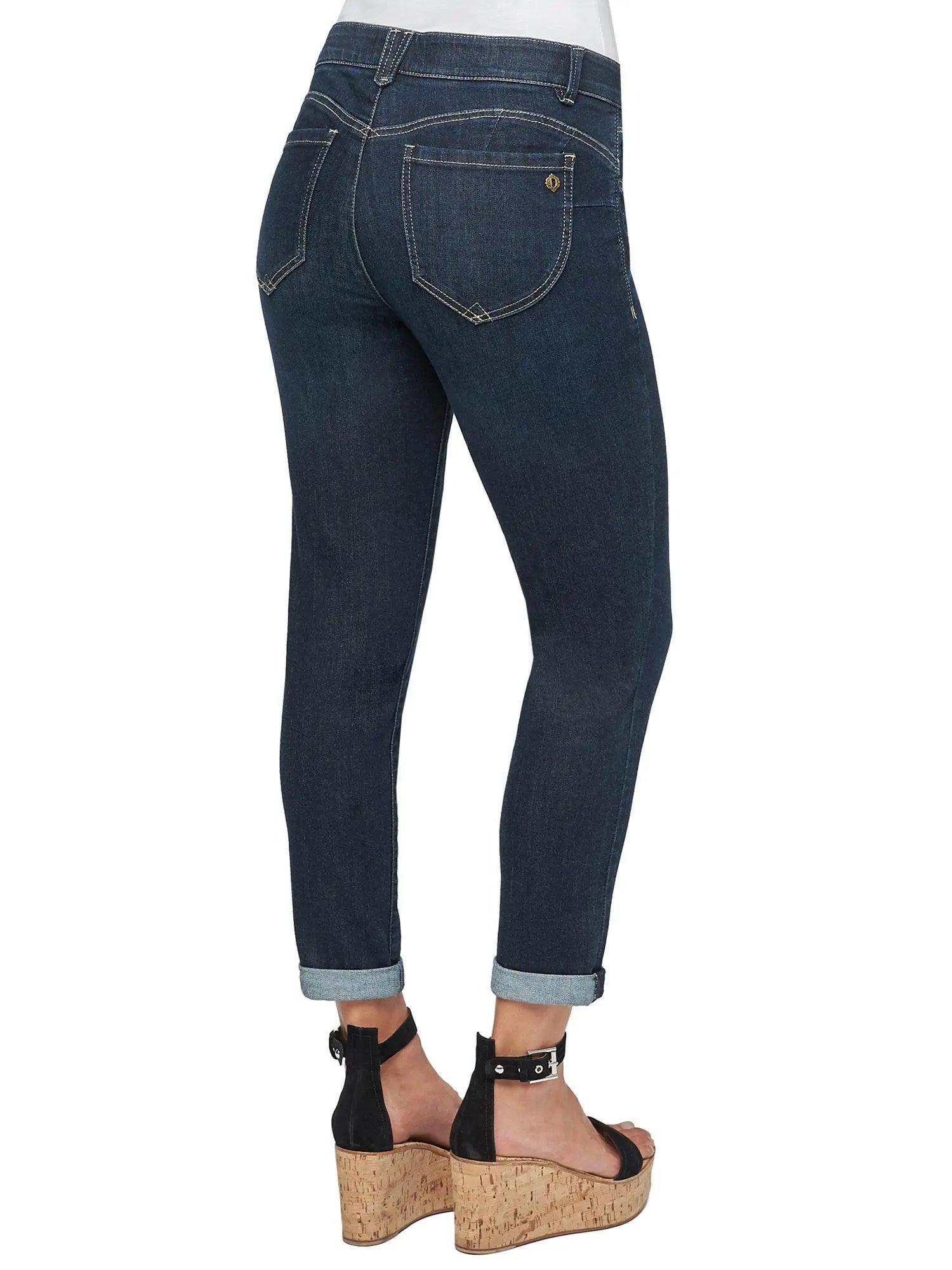 A staple you must always have in your wardrobe, the dark indigo “Ab”solution® Ankle Skimmer offers tummy control with slimming power-mesh panels, a no-gap waist, and the perfect “booty lift.” Made from incredibly soft and comfy stretch denim in an artisanal wash with delicate whiskering and fading detail. These jeans ship with a rolled cuff that “skims” the ankle; customize your look by wearing them cuffed or uncuffed at the hem. The blend of cotton, lyocell, polyester, and spandex creates a soft and luxurious denim.