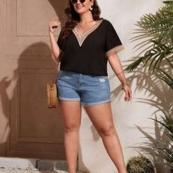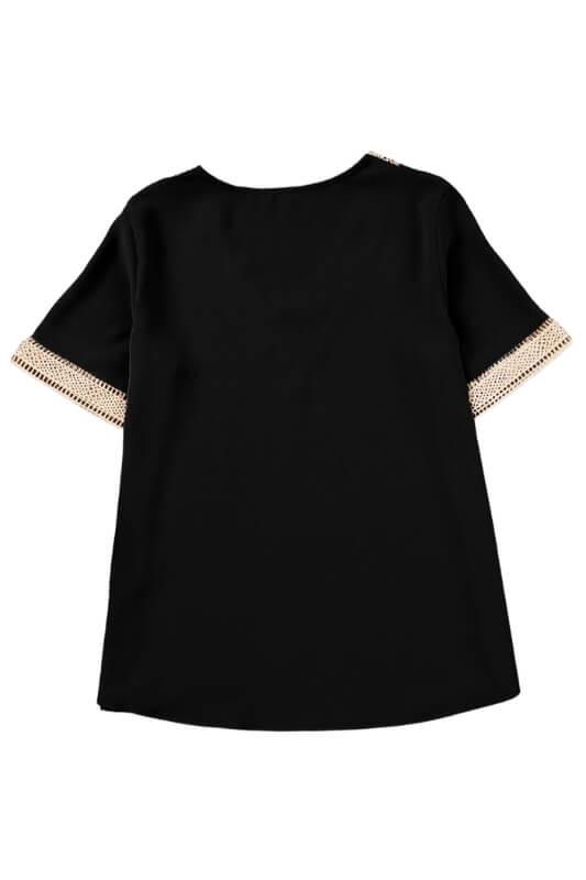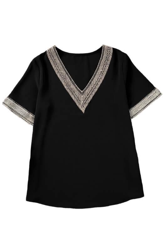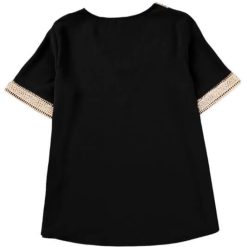 Elevate your wardrobe with our Elegant Contrast Lace V-Neck Blouse. This short-sleeved gem is crafted from 100% premium polyester, ensuring a soft touch and lasting wear. The blouse showcases a striking black base adorned with delicate beige lace fringe, adding a touch of sophistication. The V-neck, accentuated with contrasting lace trim, enhances its elegance, making it a versatile piece for both day and night. Easy to care for, it’s machine-washable, ensuring it remains pristine wear after wear.
