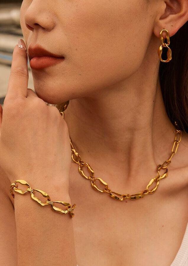 Unveil the epitome of timeless elegance with the Eternal Radiance Ensemble. Crafted meticulously from resilient stainless steel and adorned with an exquisite 18K gold-plated finish, this trio set showcases an alluring blend of durability and luxurious charm. Consisting of a necklace, earrings, and a bracelet, each piece speaks of sophistication and finesse. Whether you’re attending a grand event or a simple gathering, this set is designed to uplift your attire, ensuring you shine in every setting.