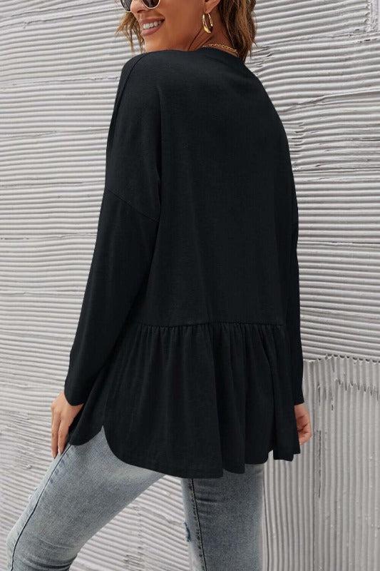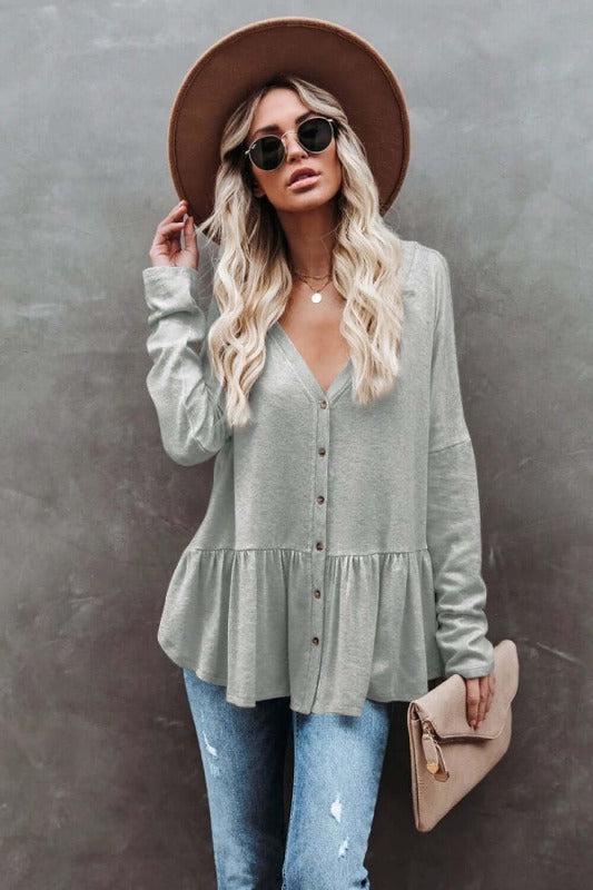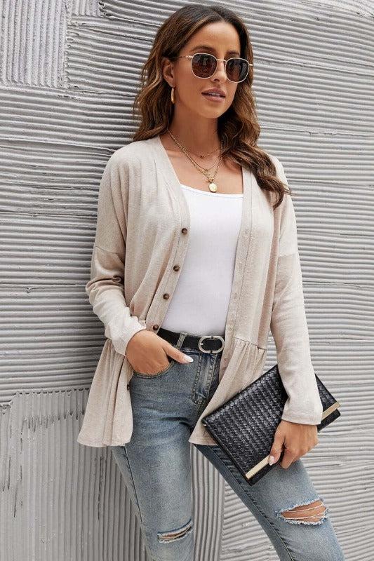 This V-neck peplum top is very versatile thanks to its cotton blend and ruffled hemline. This lightweight top, which can also be worn as a cardigan, will give your wardrobe a more casual feel.