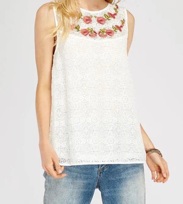 The embroidered flowers and lace overlay on this white top adds a feminine touch, while the sleeveless design keeps you cool. It’s sleeveless and fastens in the back with a single gold button. This lining and flowy top is ideal for summer days or evening events. Add a cardigan for a cooler summer night, or the detailing is ideal for finishing off any winter outfit with elegance. Fits true to size.