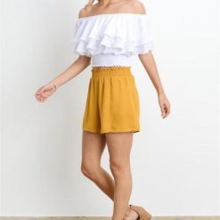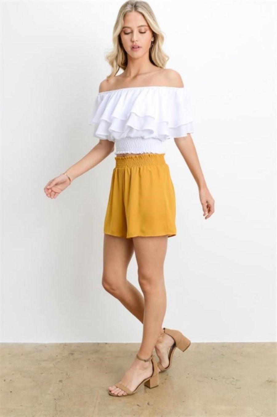 These mustard-colored shorts are perfect for a hot football game! They’re super comfy and easy to match with a smocked waist.