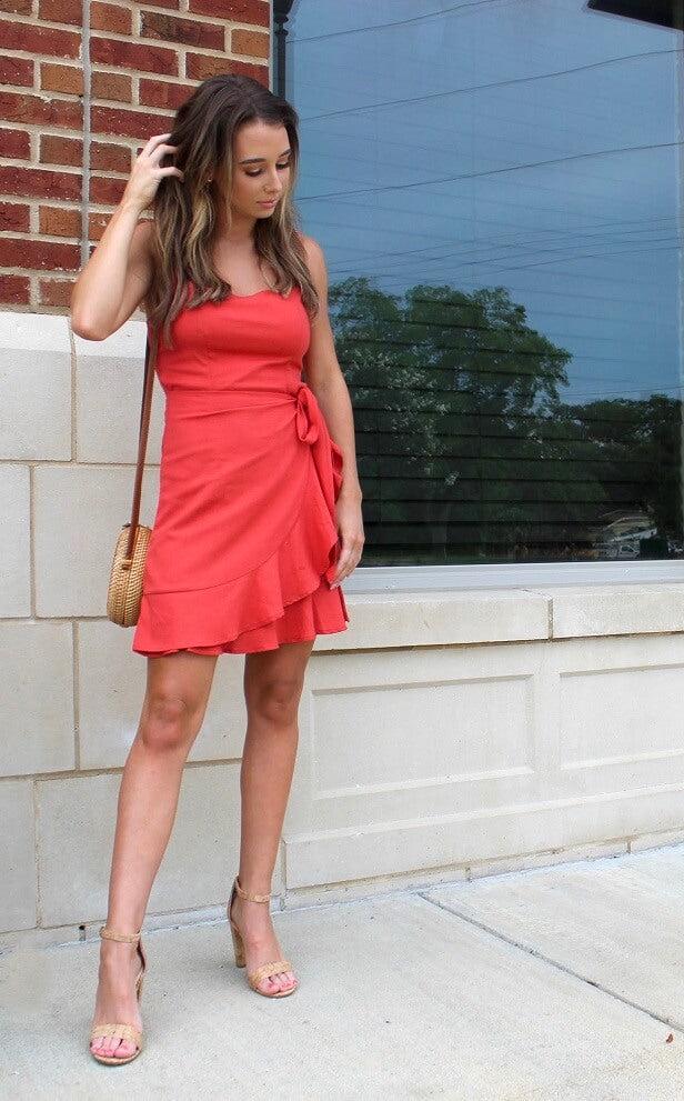 First class and front of the line is how you will be treated in this gorgeous dress. This dress has a hidden zipper, front tie details with ruffles, and adjustable straps. As soon as you slip in this dress you already feel the compliments coming your way!