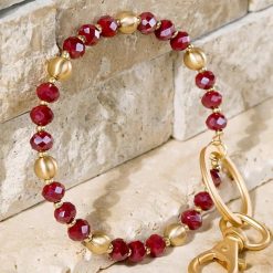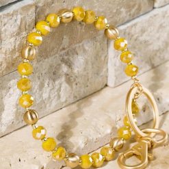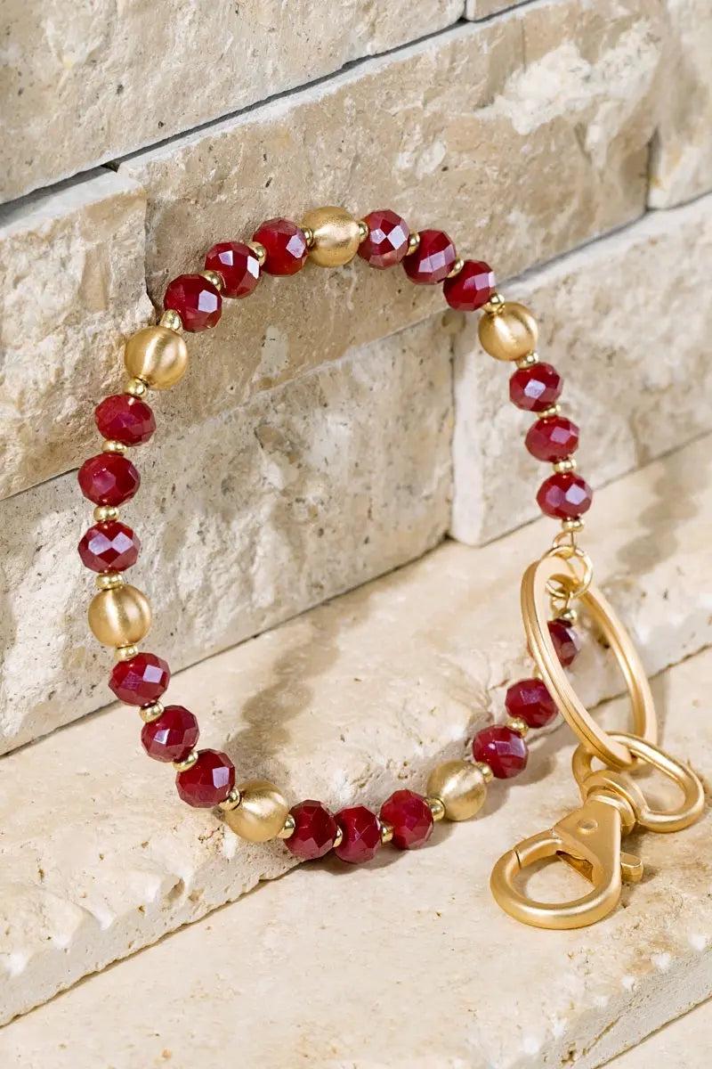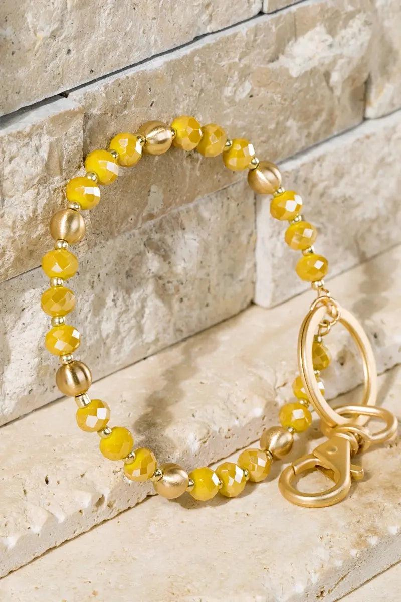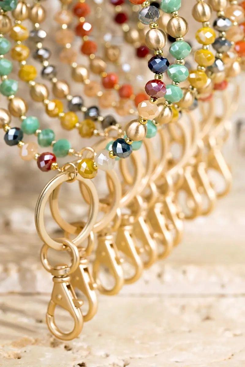 We are in love with these super stylish and functional key-ring bracelets! It features beautiful satin metal beads and shimmery glass beads with a swivel lobster clasp.