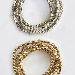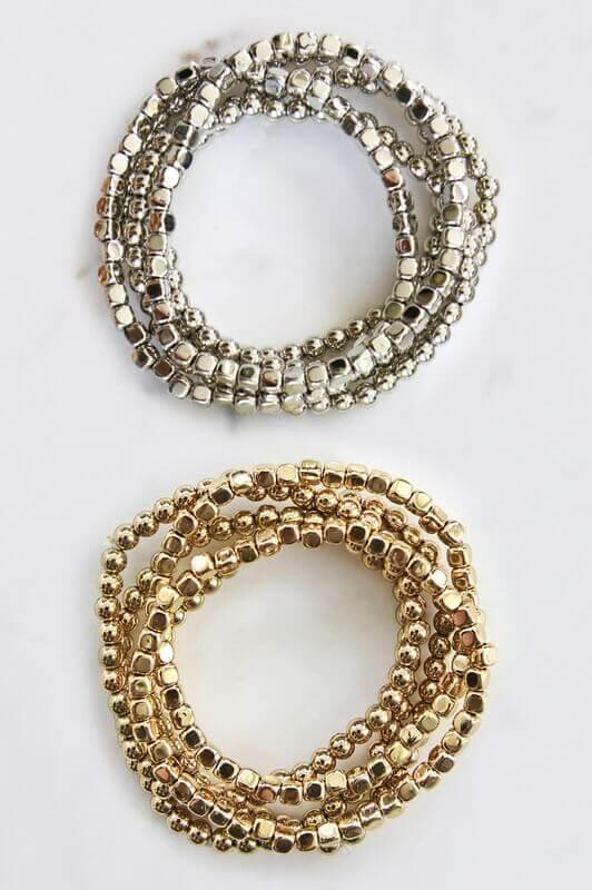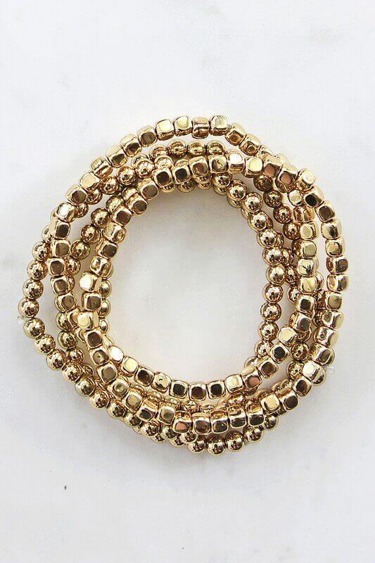 This Gold Bead Stretch Bracelet Set are perfect to go with every outfit! The metal beaded stretchy bracelets come in a set of six, with three round and three square beads. They make a great gift too!