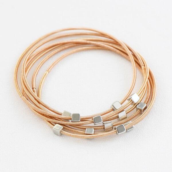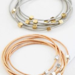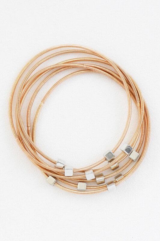 Looking for a unique and stylish bracelet set that will jazz up any outfit? The stretchy gold bracelets are adorned with square silver accents for a geo style that is sure to turn heads.