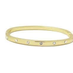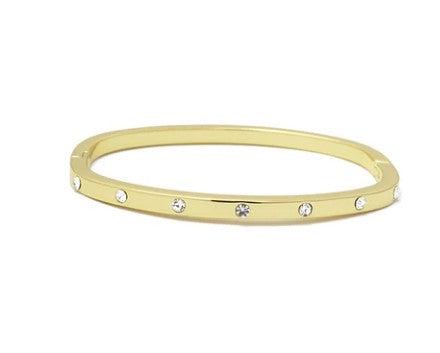 This stackable bracelet in gold with a hinge closure is made of surgical steel with infused gold featuring inset diamond CZs. This bangle bracelet is an elegant yet simple piece that can be worn on its own or stacked seamlessly with other bracelets. With a classic gold finish, this bracelet will beautifully accentuate any outfit and bring some glitz to any day or night occasion!