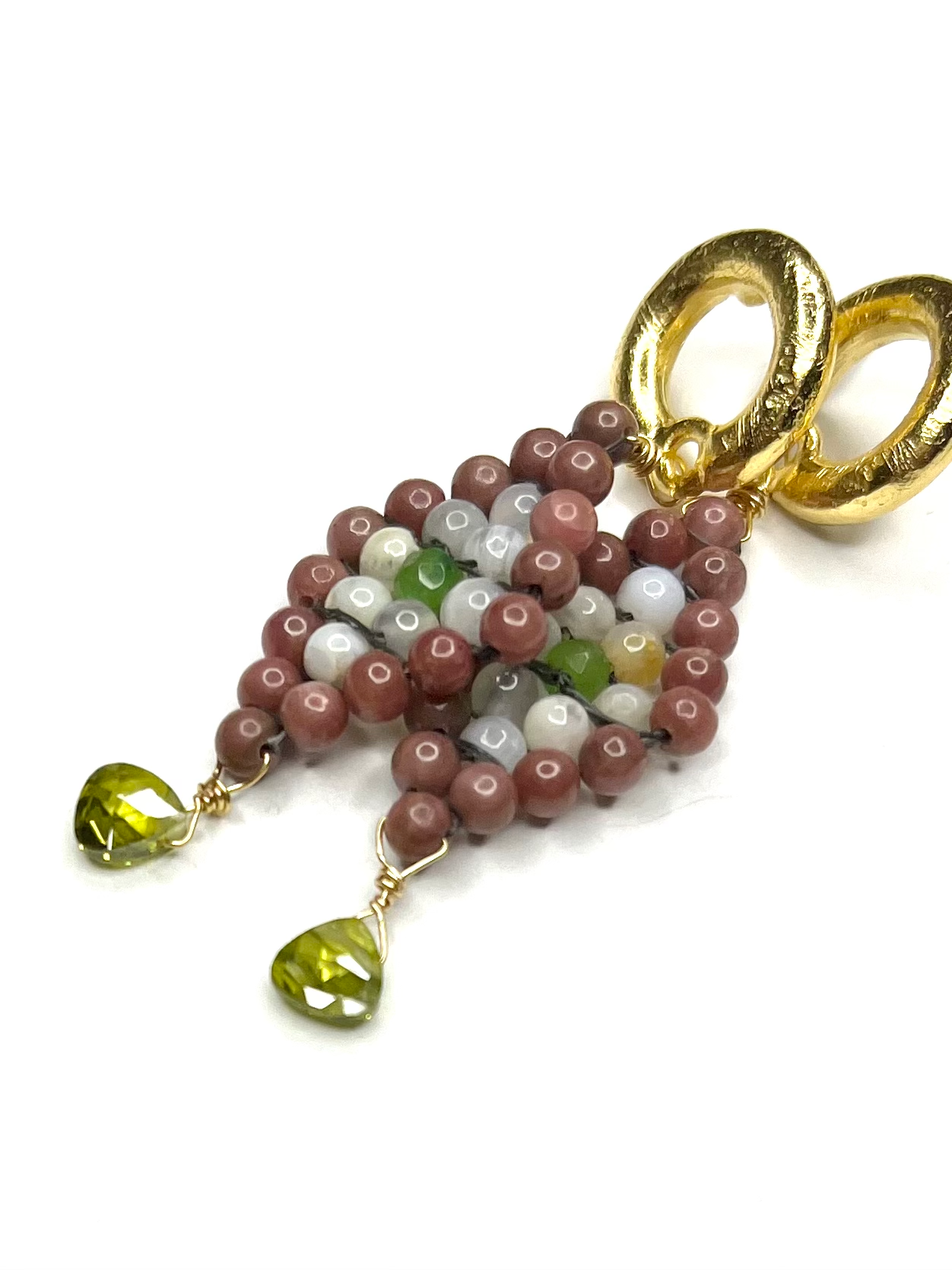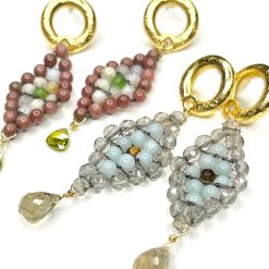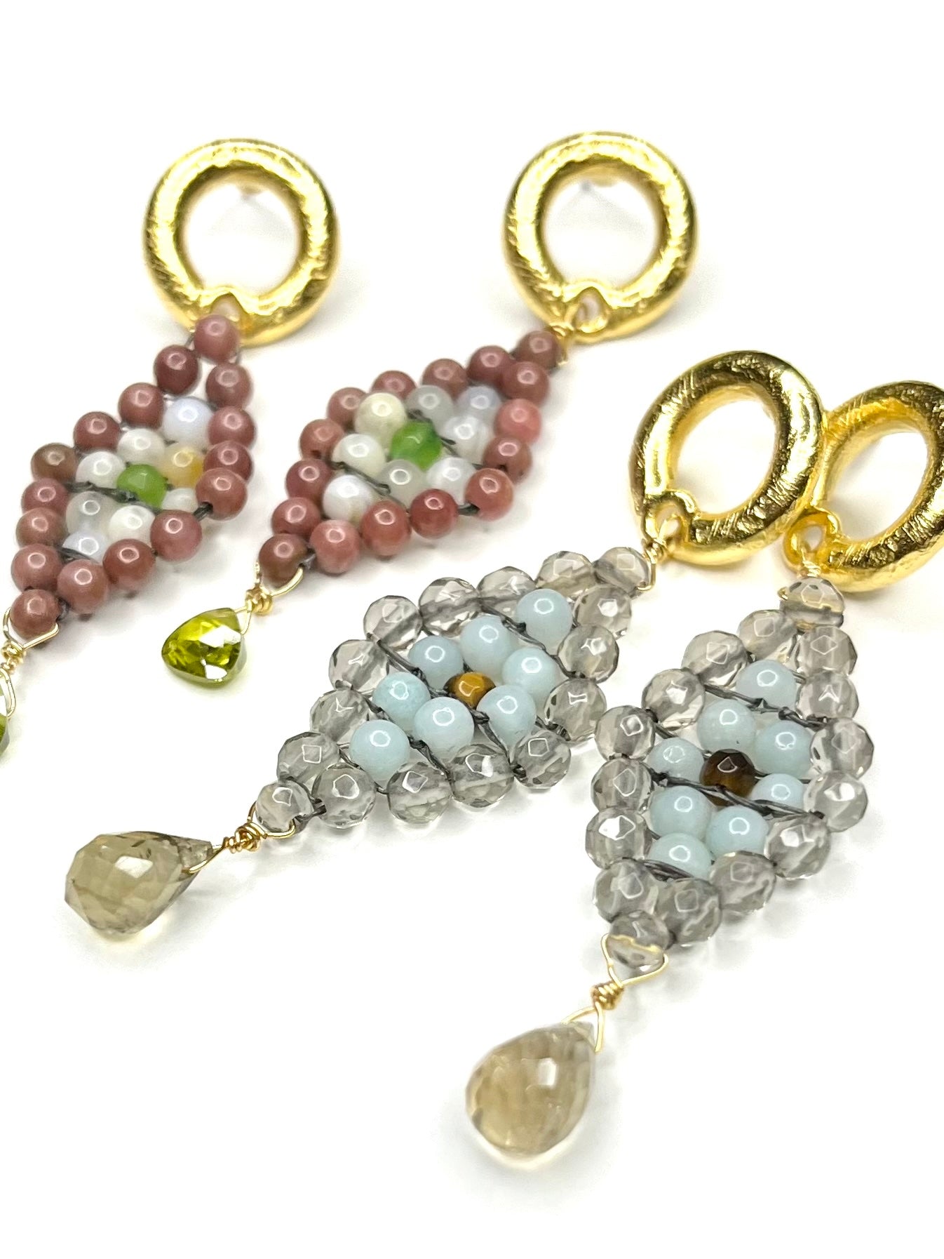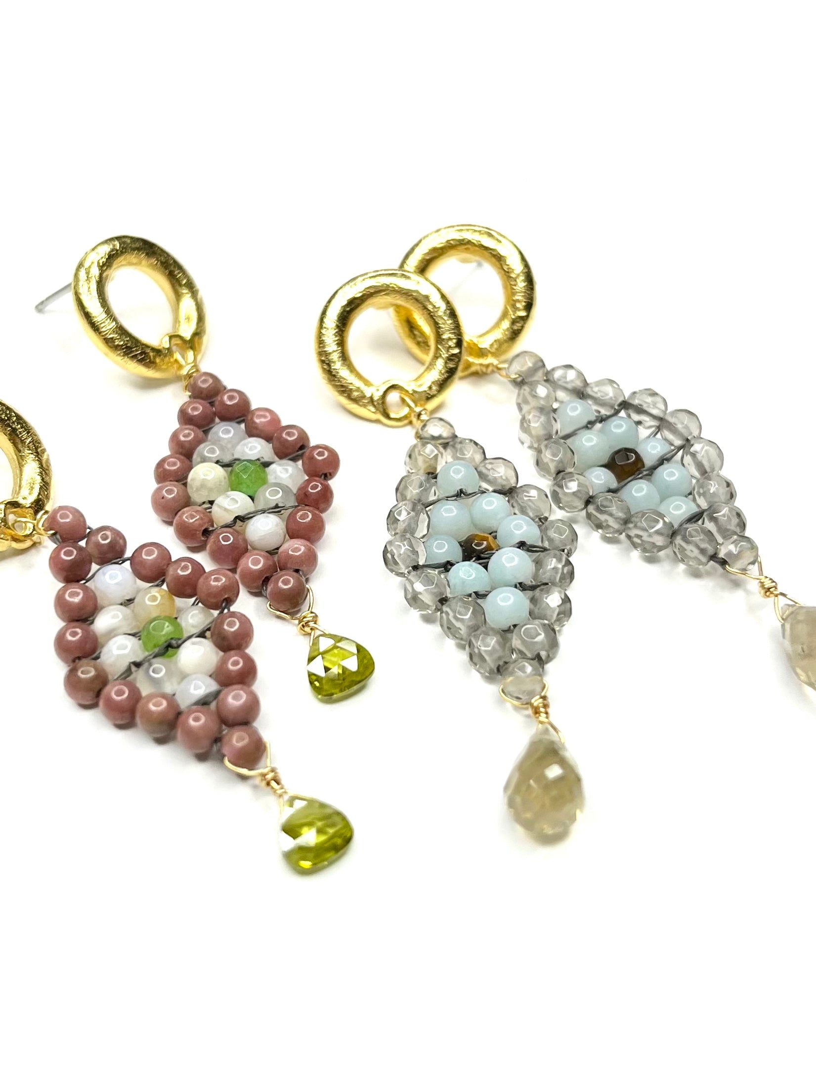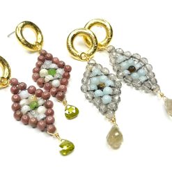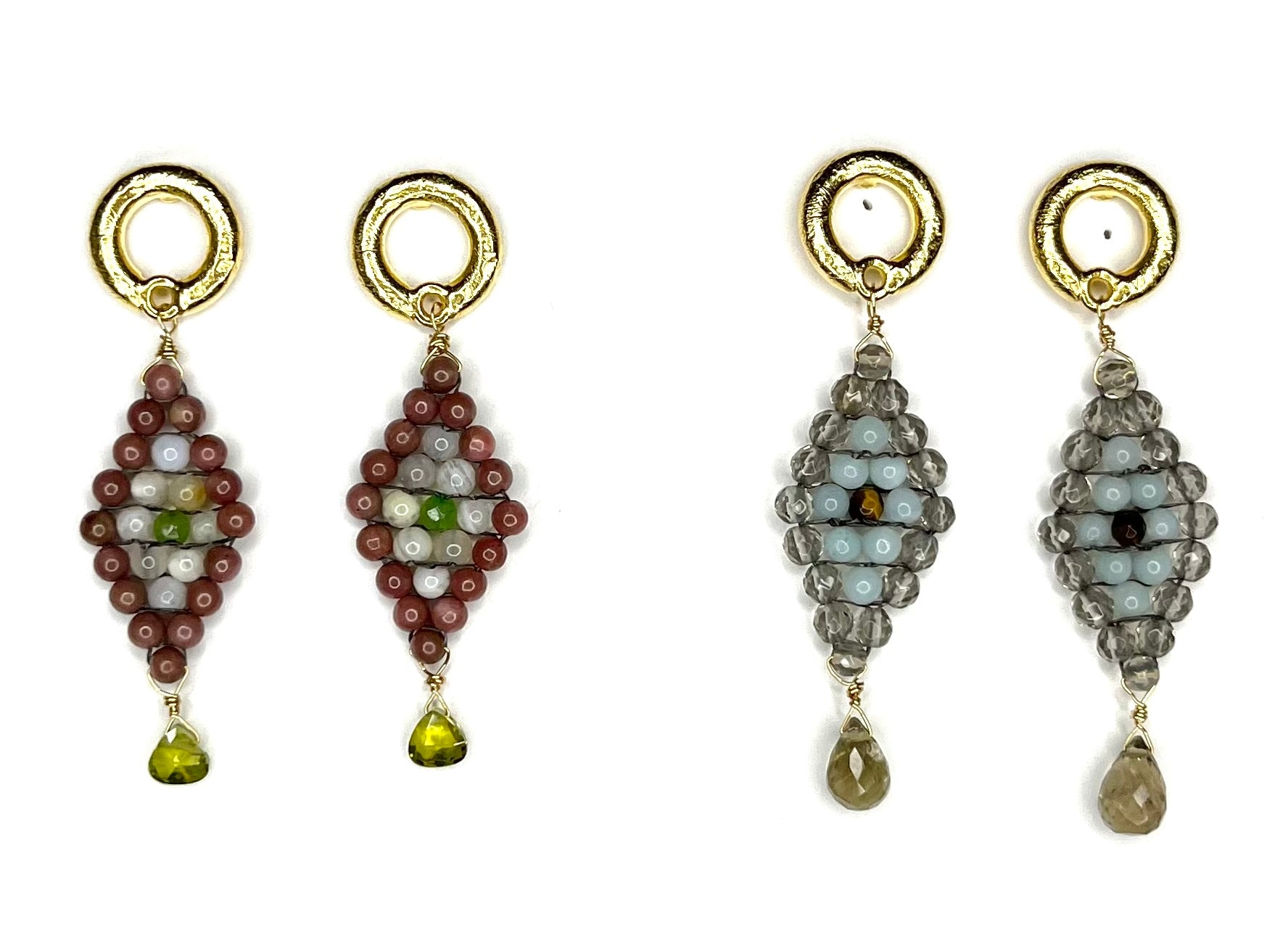- Dangle Drop, Handwoven Earrings Fashioned from Mixed Gemstones- these are our signature peyote stitch earrings; we elevate the Native American beading technique by using gemstones.