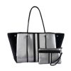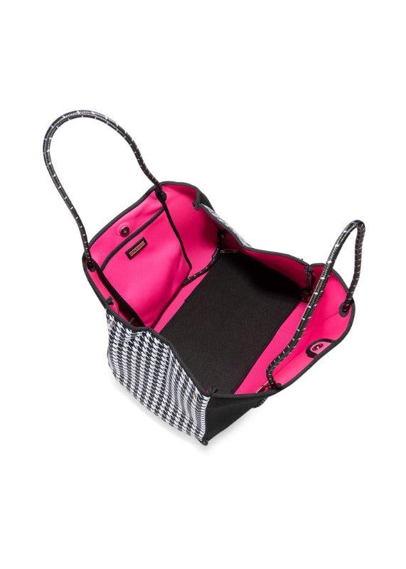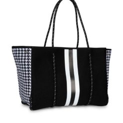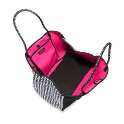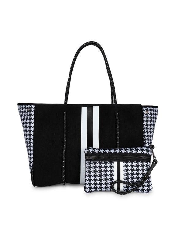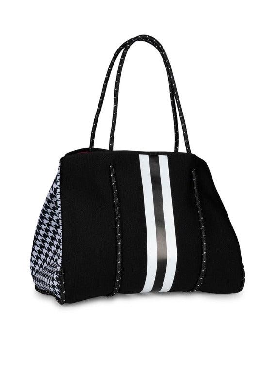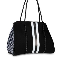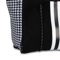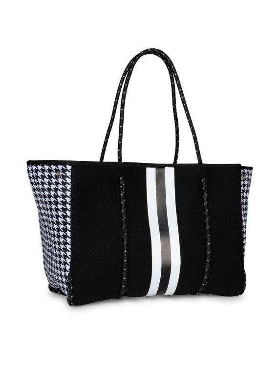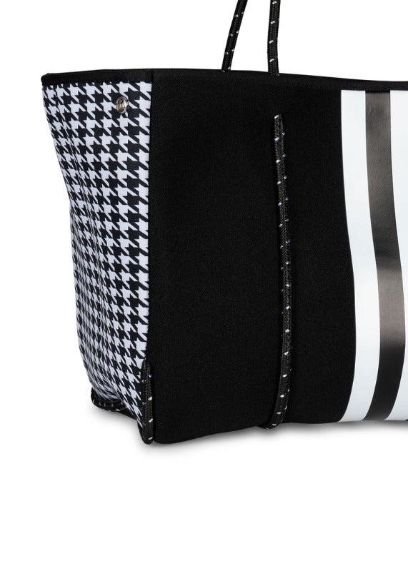 Black/Black & White stripe with houndstooth sides. This neoprene tote is the perfect blend of style and functionality.