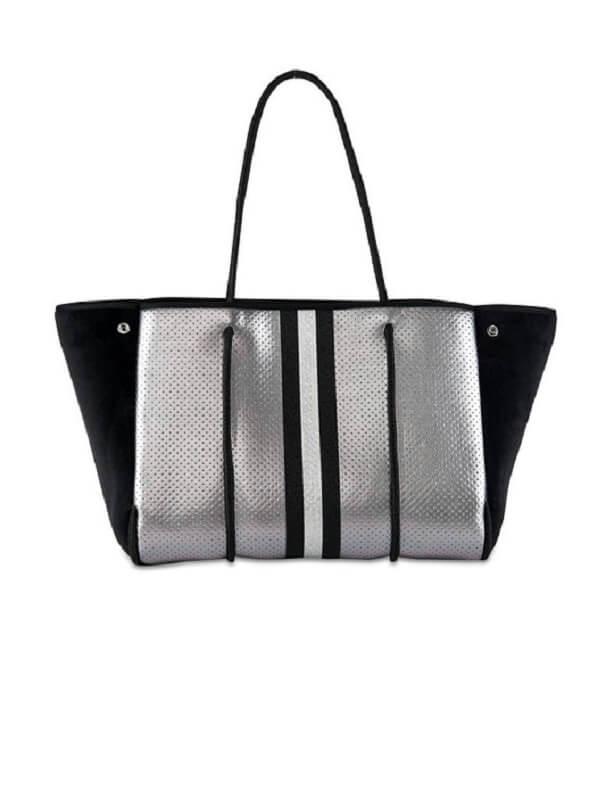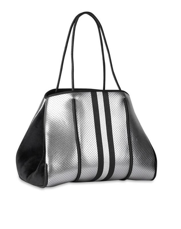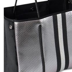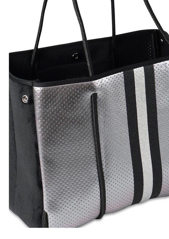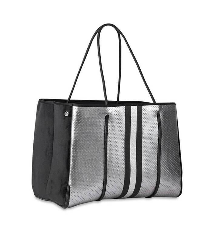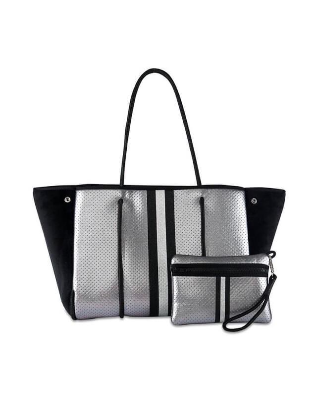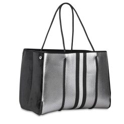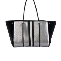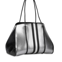 This neoprene tote is the perfect blend of style and functionality. Ultra-lightweight Side panels expand for a phantom shape or snap-in for a streamlined look Removable hard bottom liner Removable wristlet pouch Washable with mild soap. Hang dry. For coated editions hand wash is recommended.