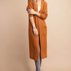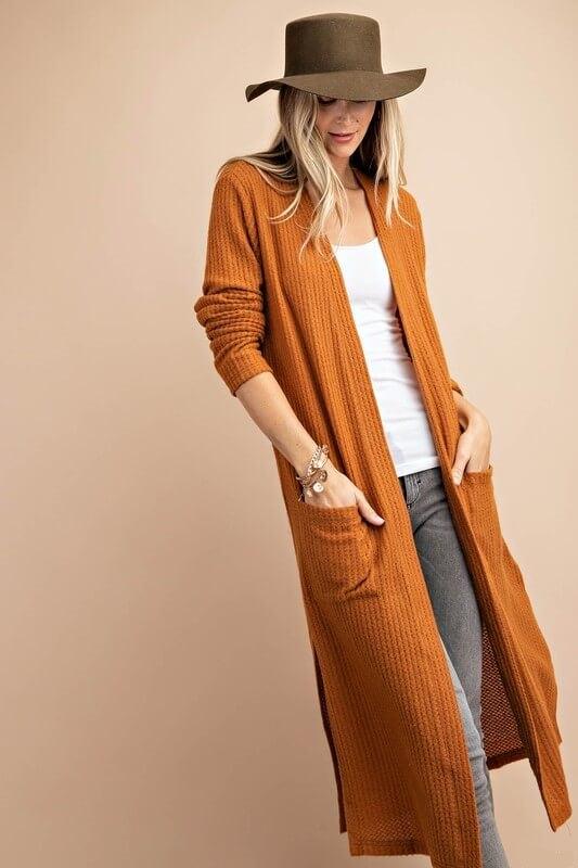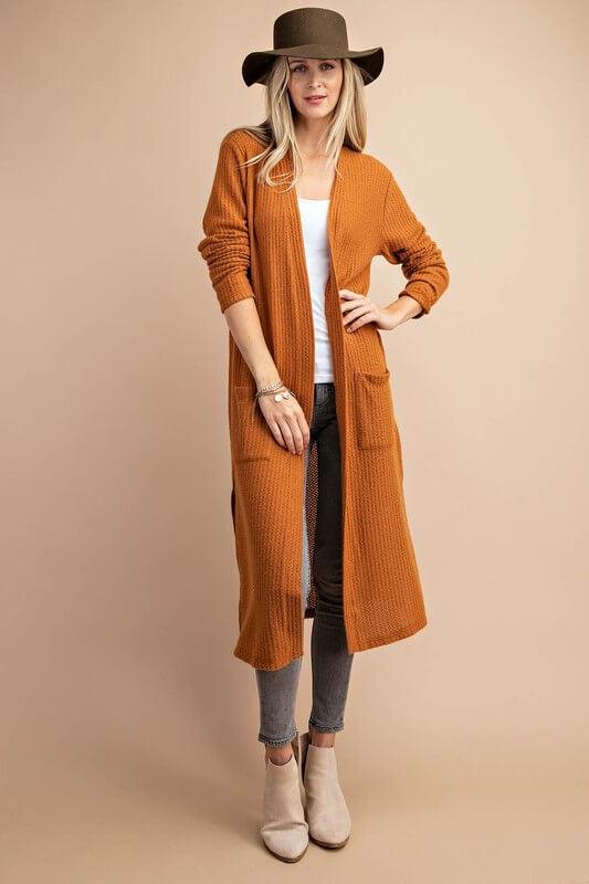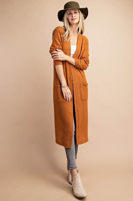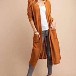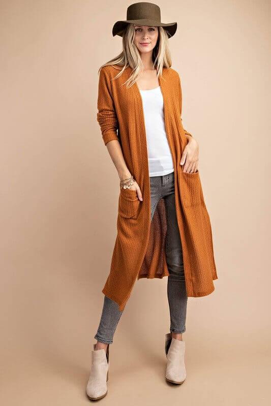 Looking for a cardigan with a difference? Look no further than the Hazel open-front long pocket cardigan! This stylish duster cardigan is made from brushed waffle knit fabric and fits true to size. It’s perfect for those chilly days or evenings when you need an extra layer of warmth. But that’s not all – the Hazel also features two handy front pockets, perfect for keeping your hands warm or storing your essentials. So why wait?