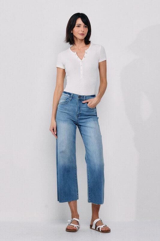 So don’t wait – rock these high rise cropped wide leg jeans with light hip distressing and raw hem today and be the envy of all your friends.