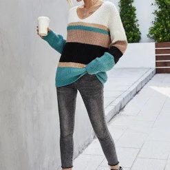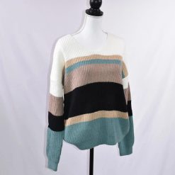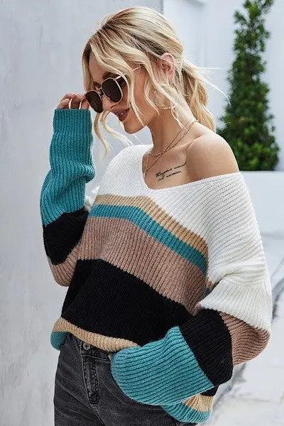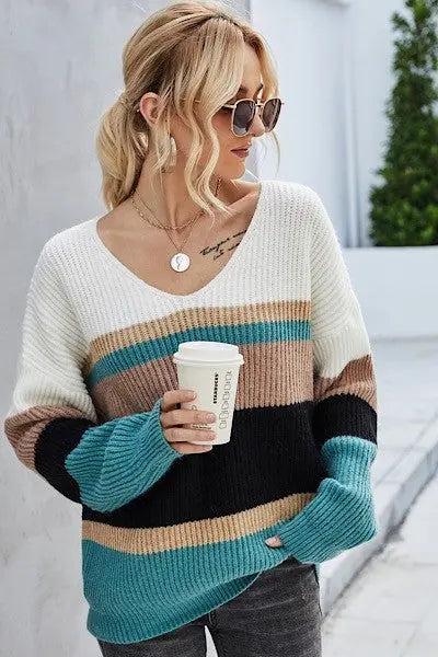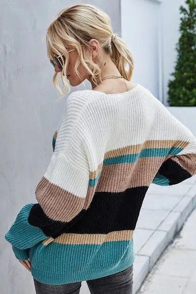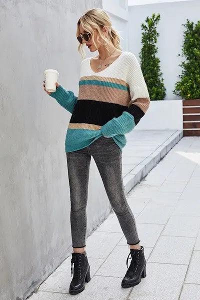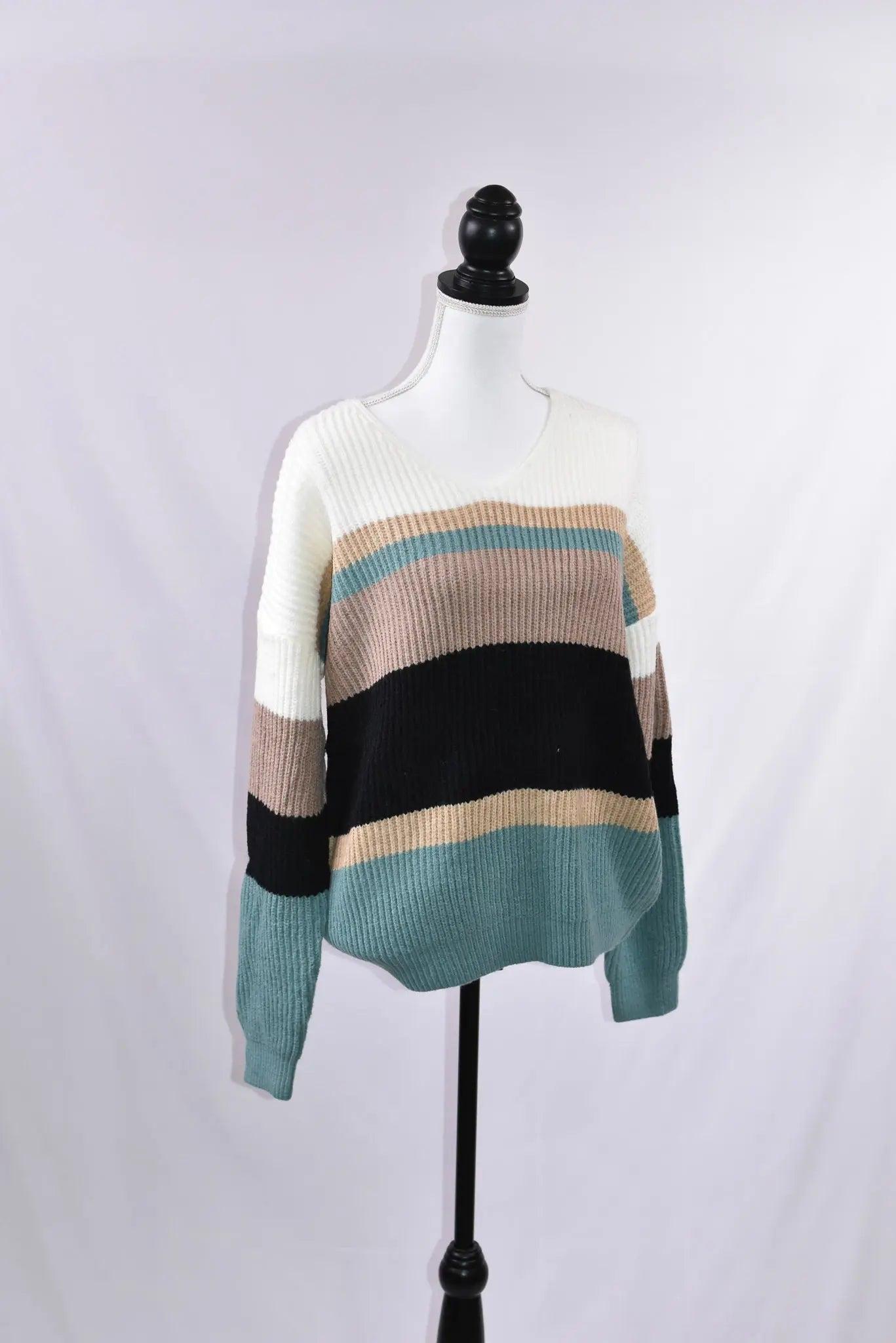 This sweater is one of our favorites, not just because it looks great on lots of body types, but also because of the color combination! We love it, and you will too.
