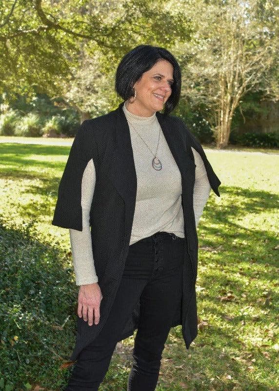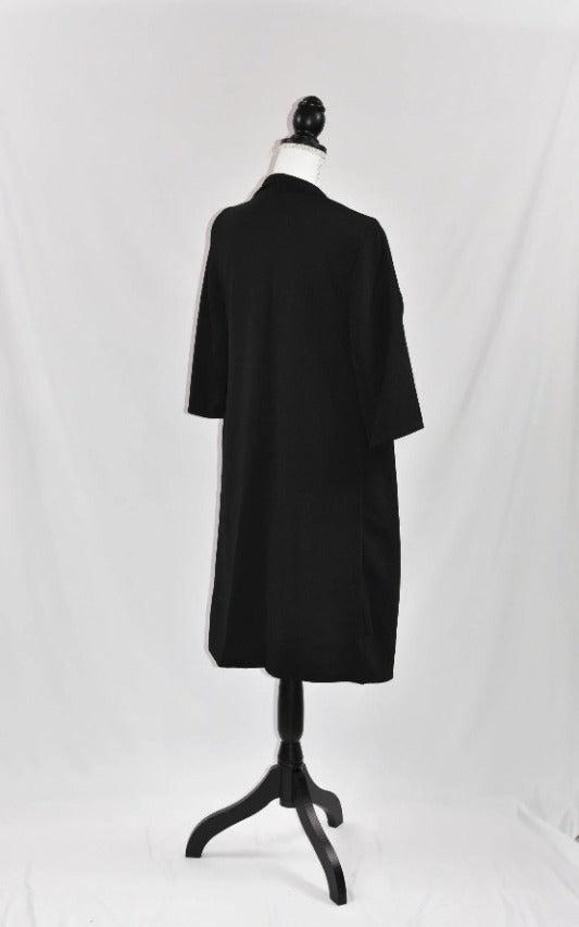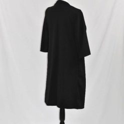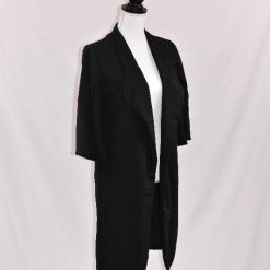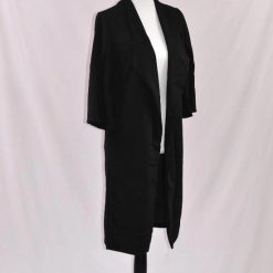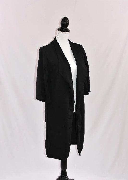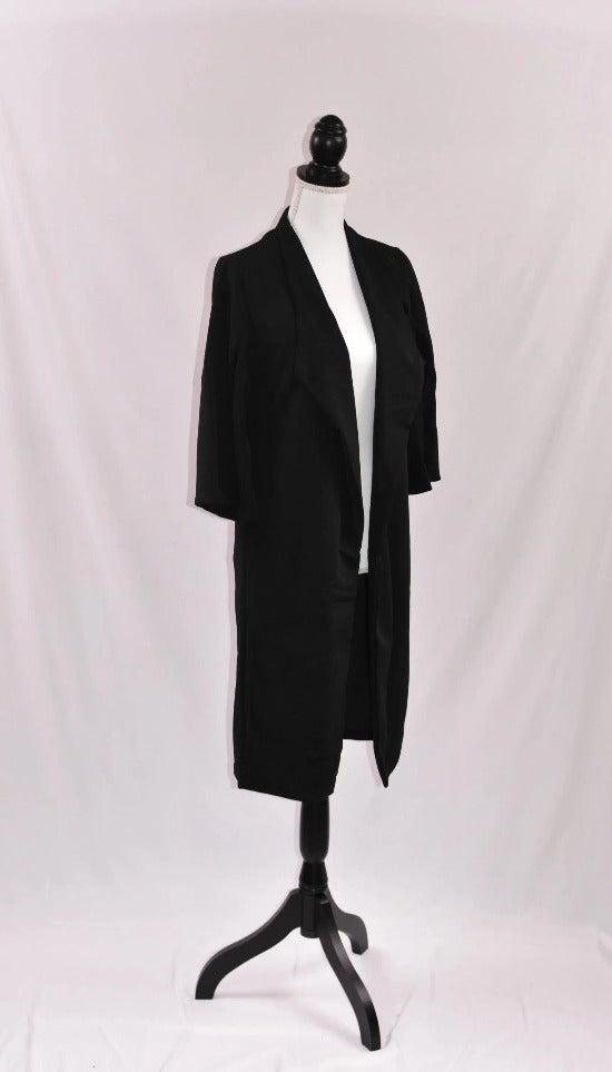 - Solid knee-length coat with 3/4 open sleeves and an open front.