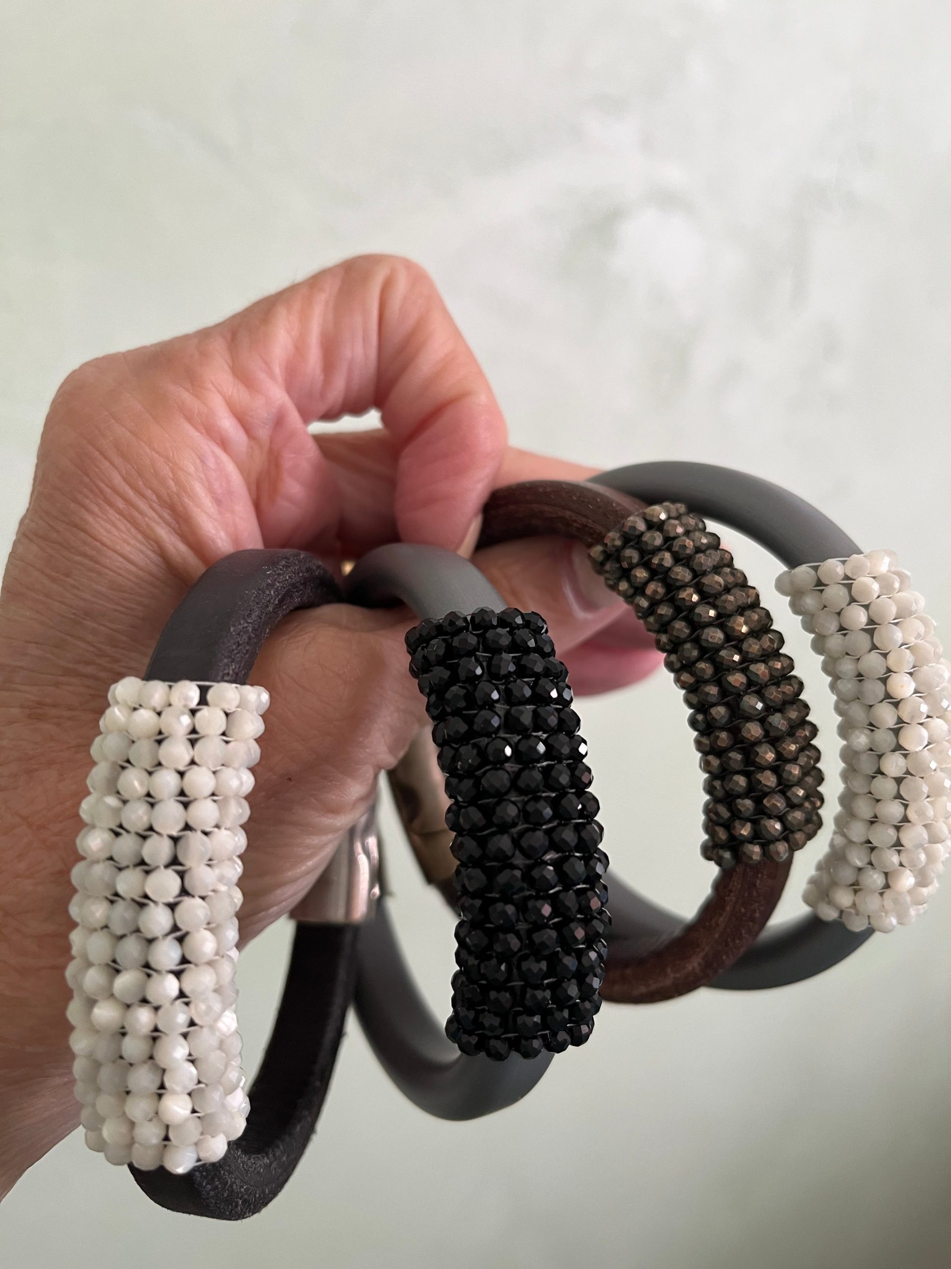 - Mixed Media Jewelry- leather or rubber bracelet with hand woven gemstones
