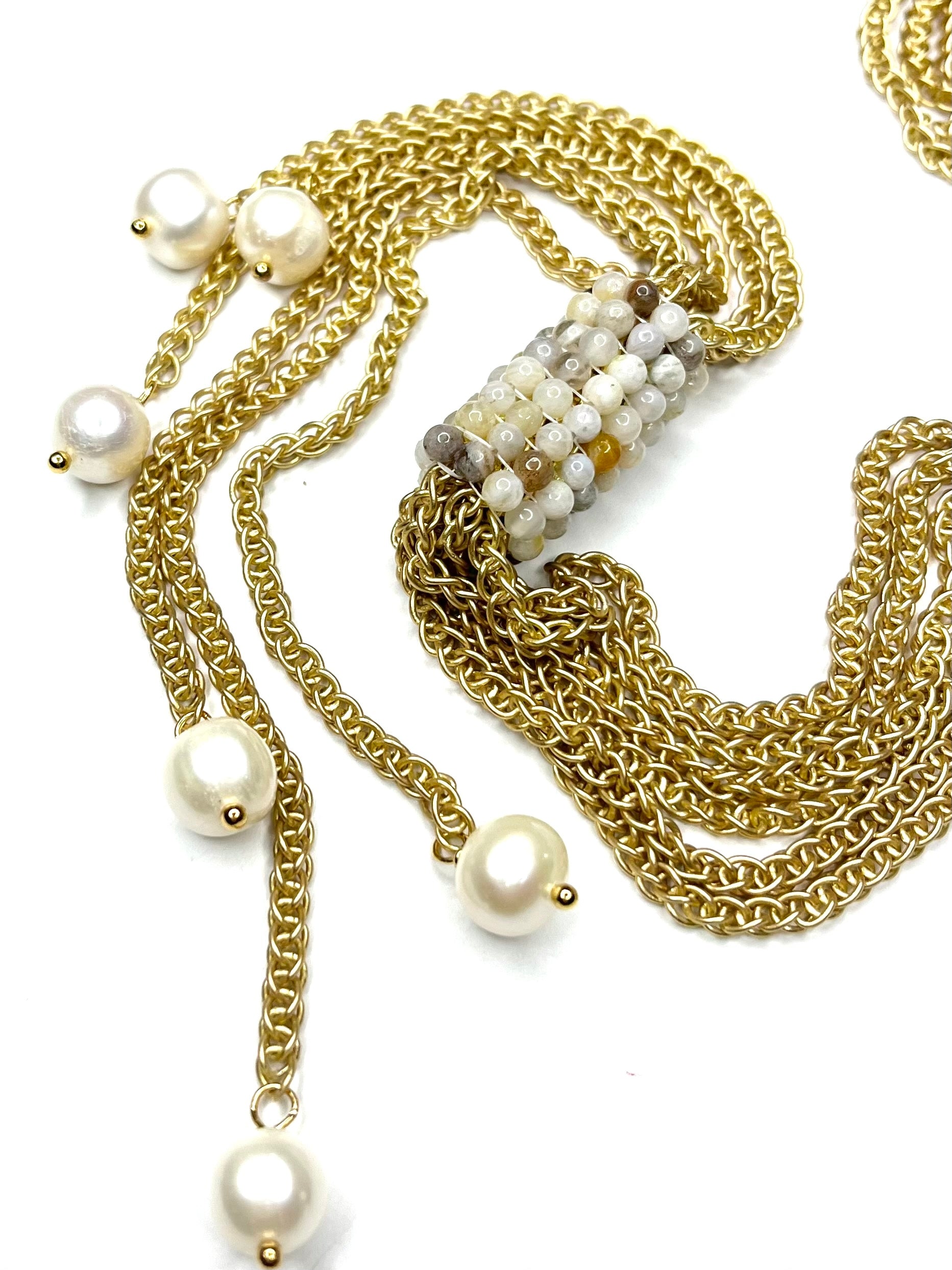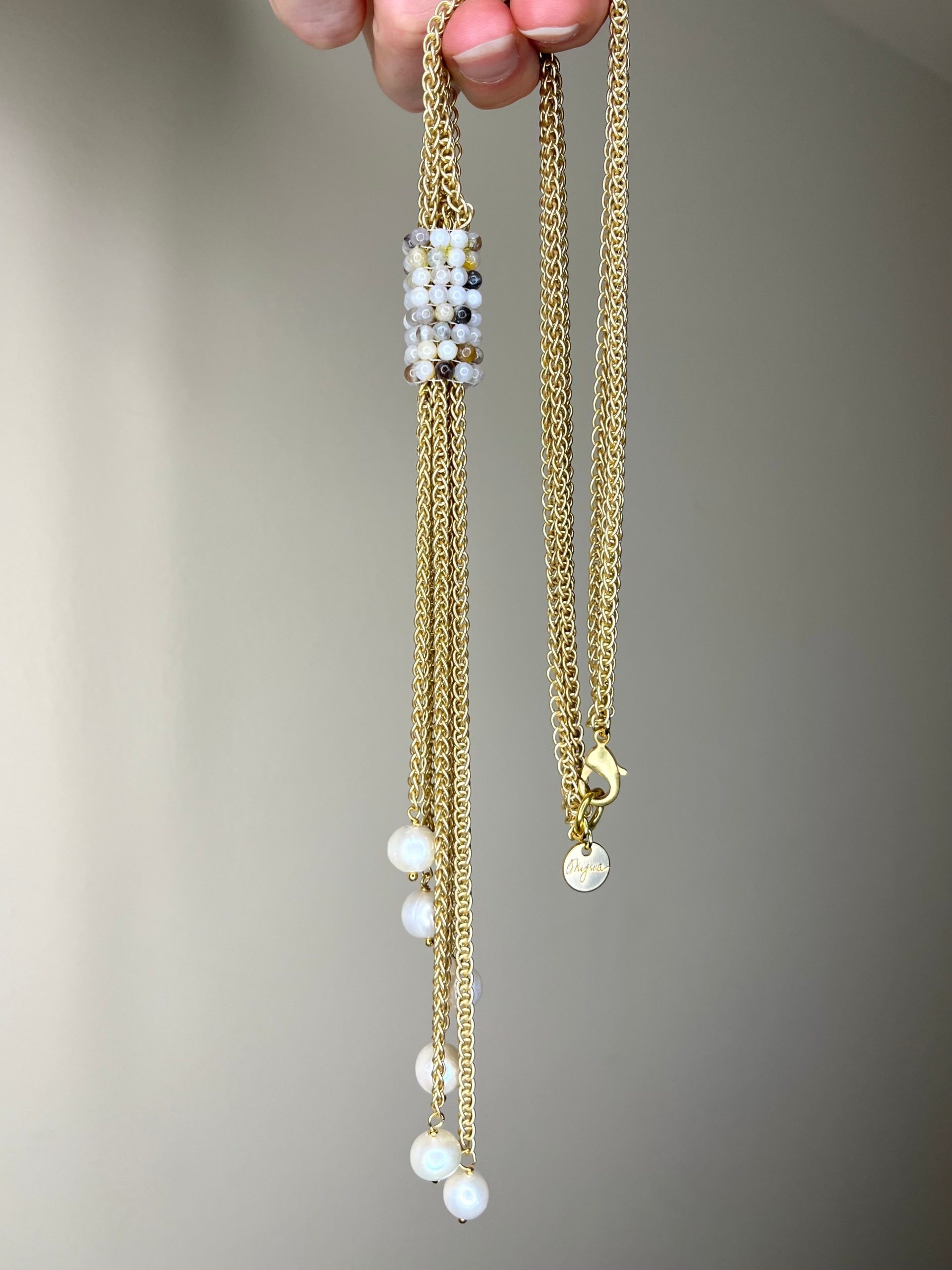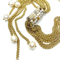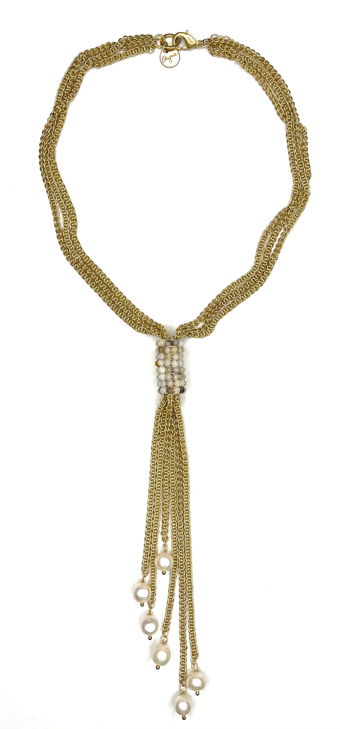 - Gold and Pearl Necklace-?this short Y necklace features out signature hand woven beading in Flower Jasper