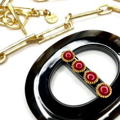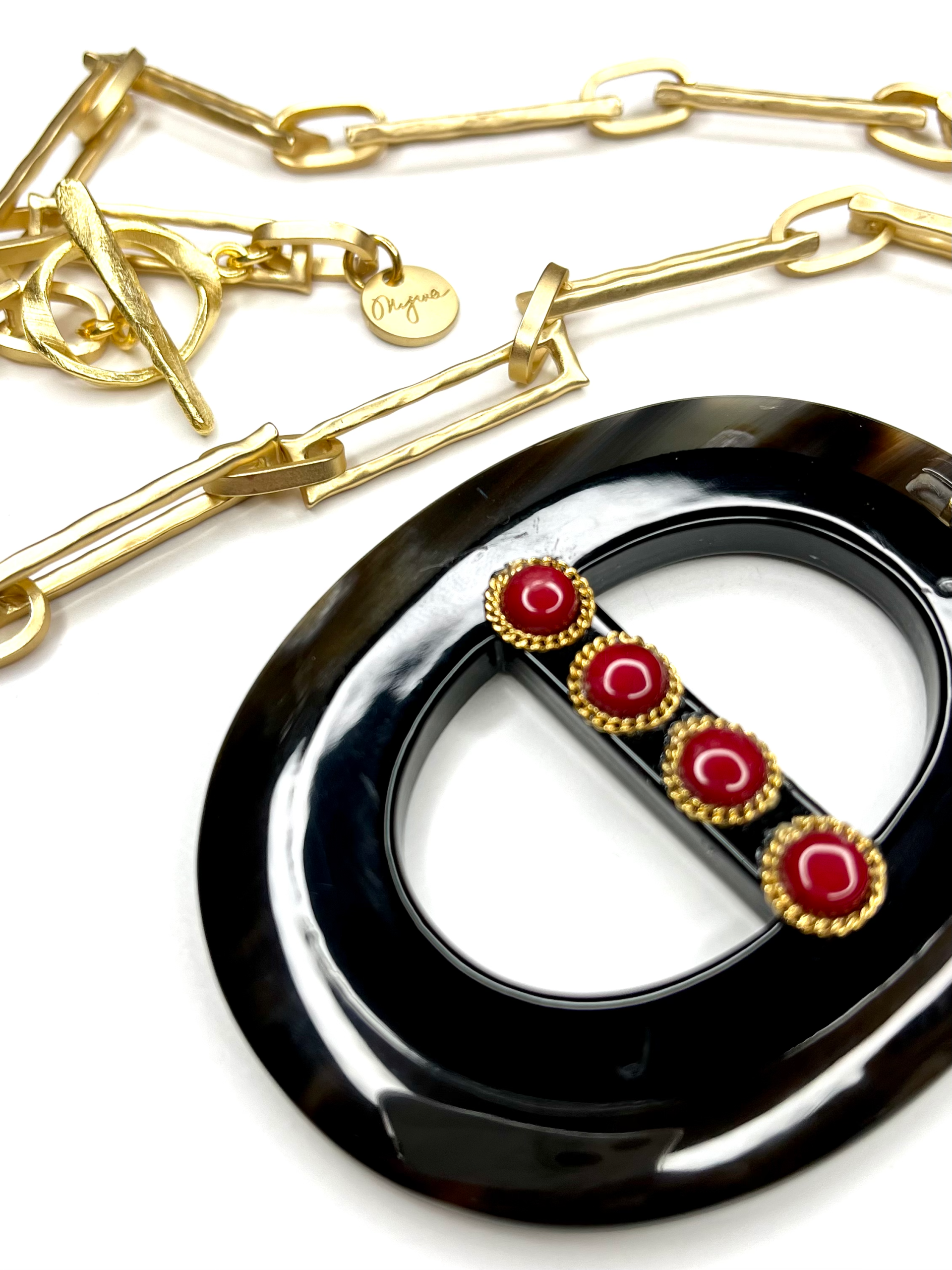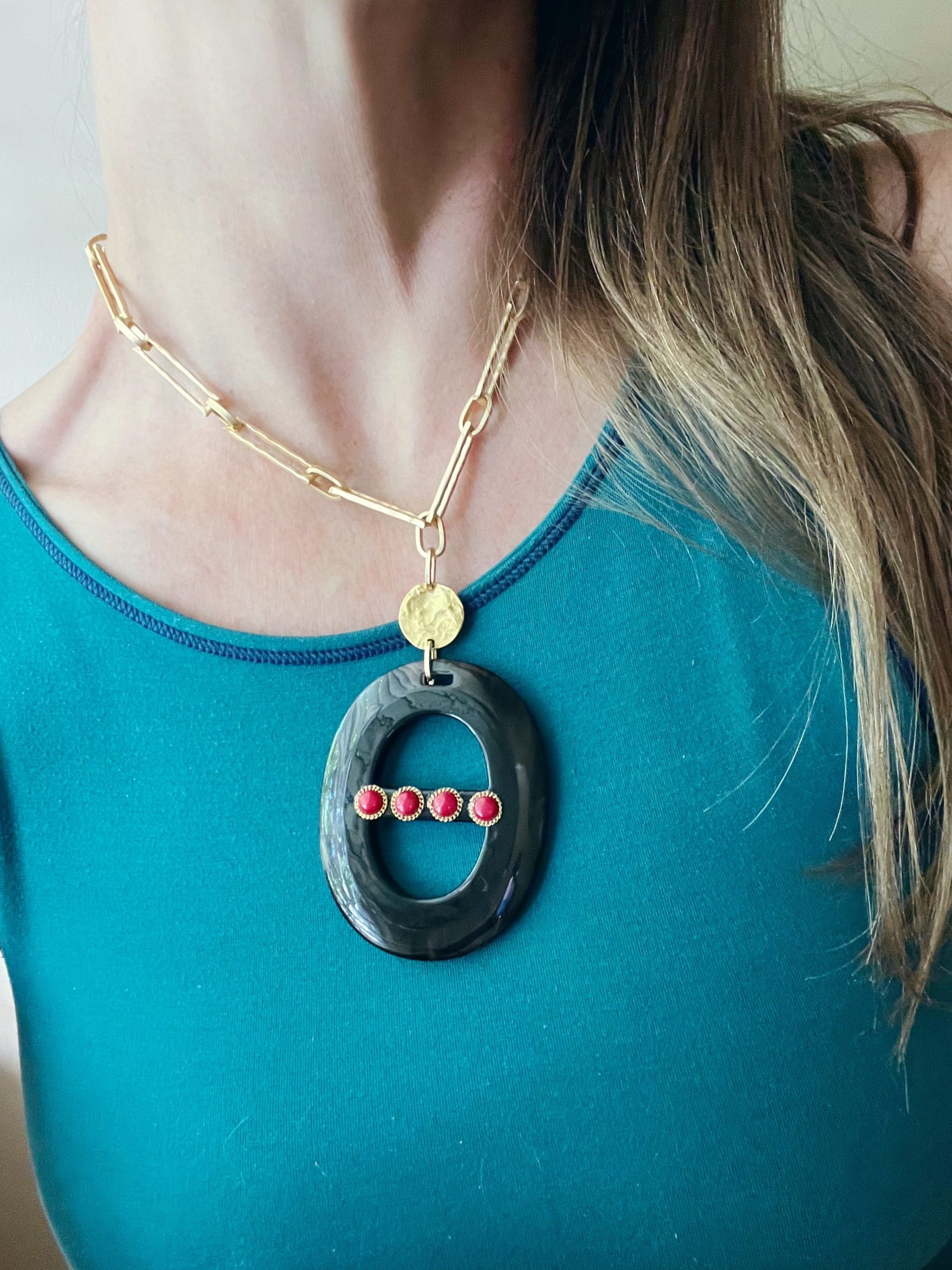 - Hand Carved Organic Pendant with Red Coral Cabochons- super striking everyday necklace that could even be dressed up for a black tie evening.