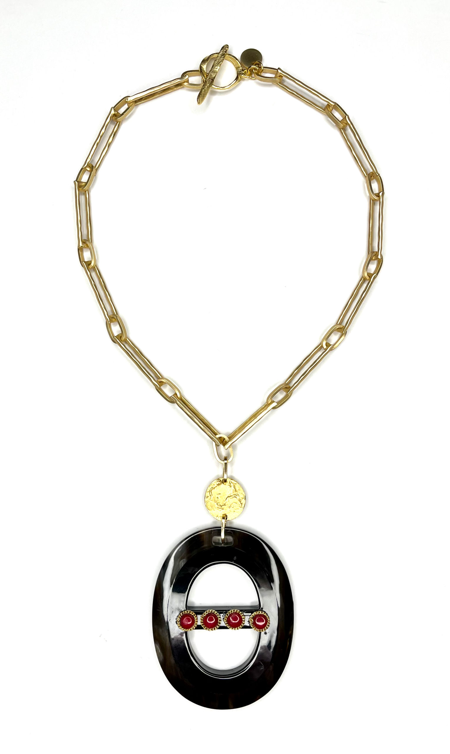 - Part of Our Mixed Media Jewelry Trend-? great mix of elongated heavy satin gold plated chain, and gemstone cabochons adorning an organic pendant custom made in Vietnam.