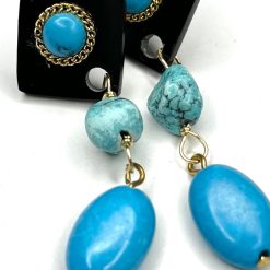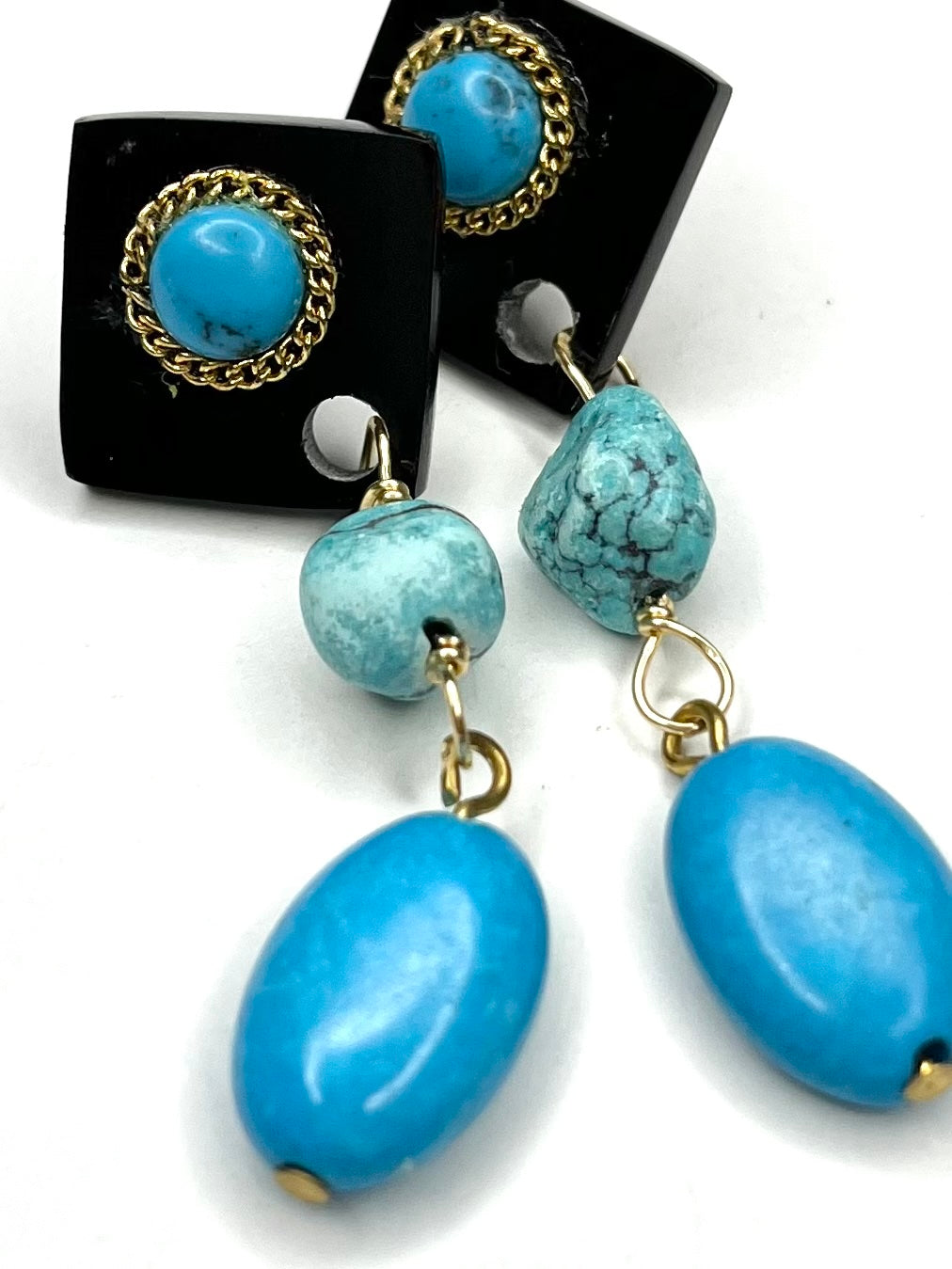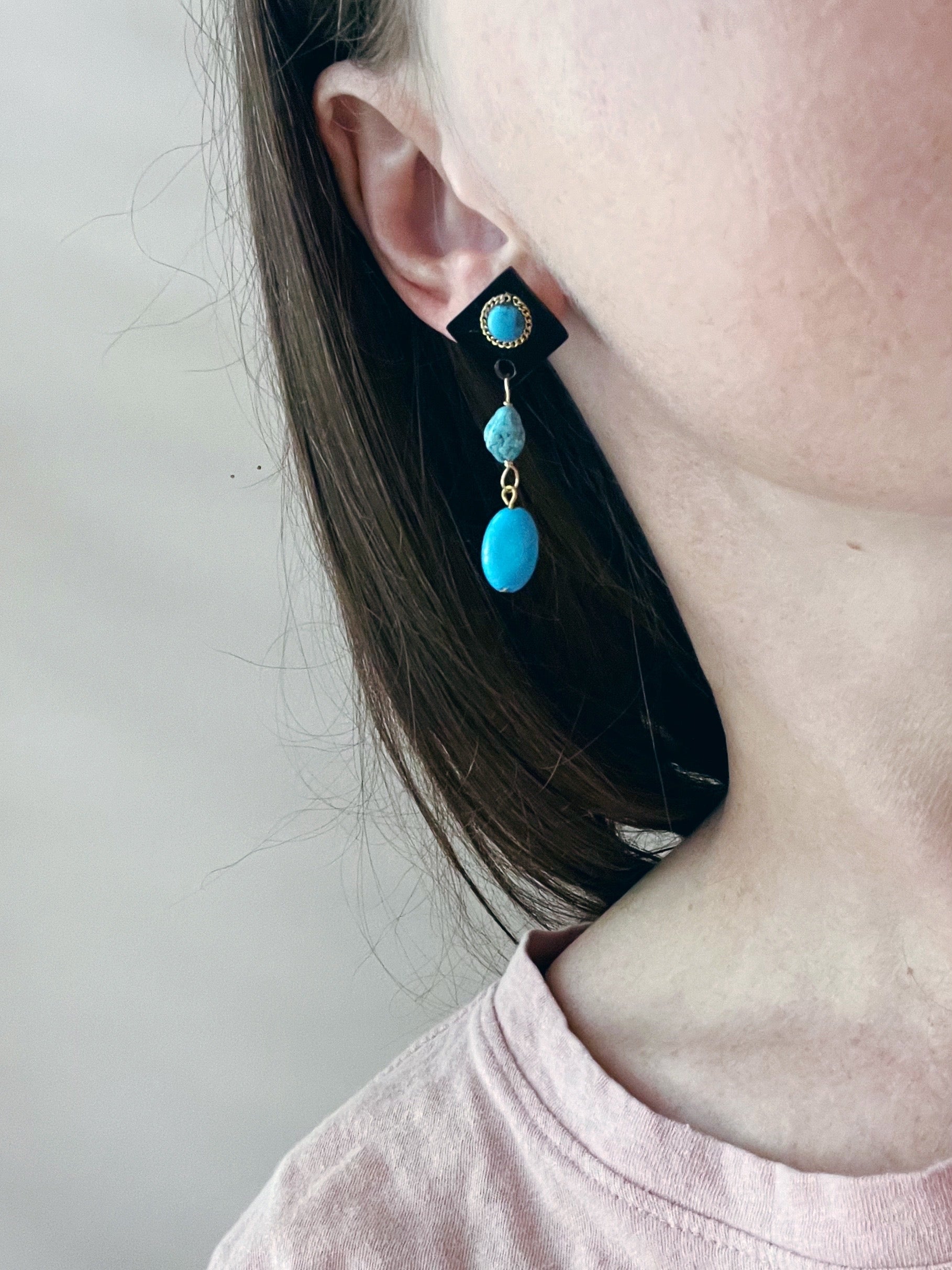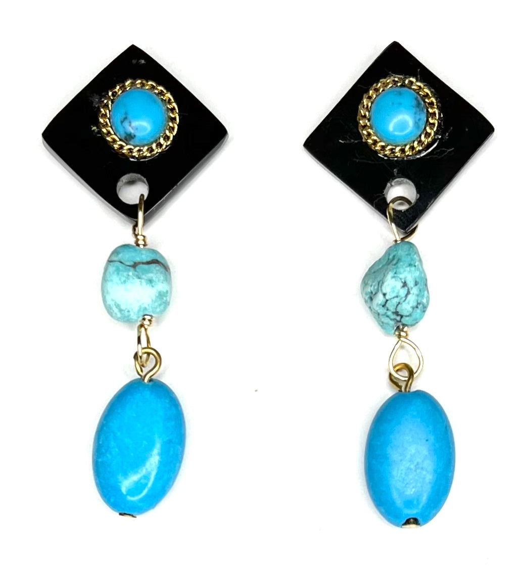 Three Forms of Turquoise, Cabochon, Nugget and Polished- synthesized to create an appealing linear earring designed to be enjoyed day to evening