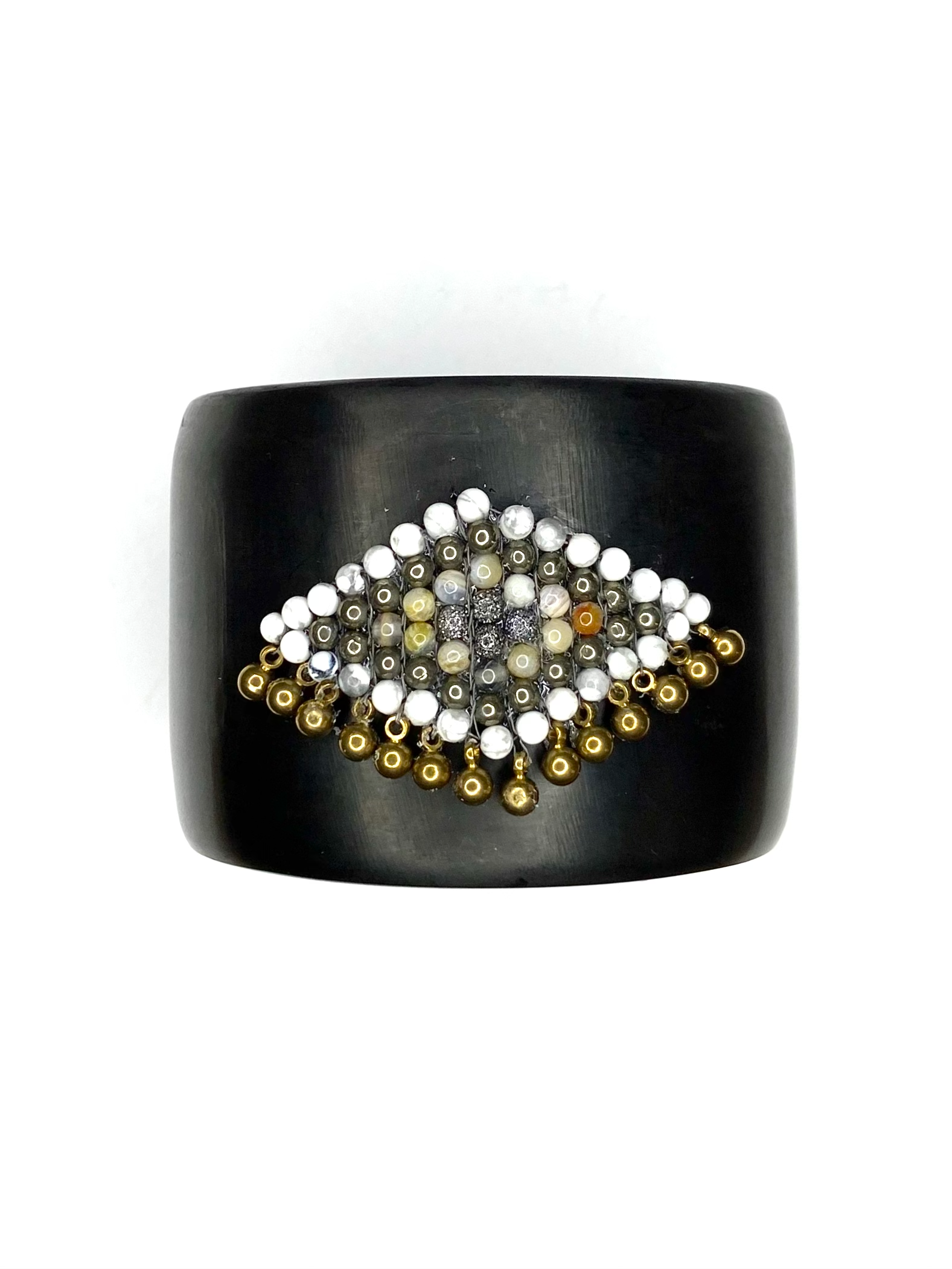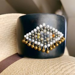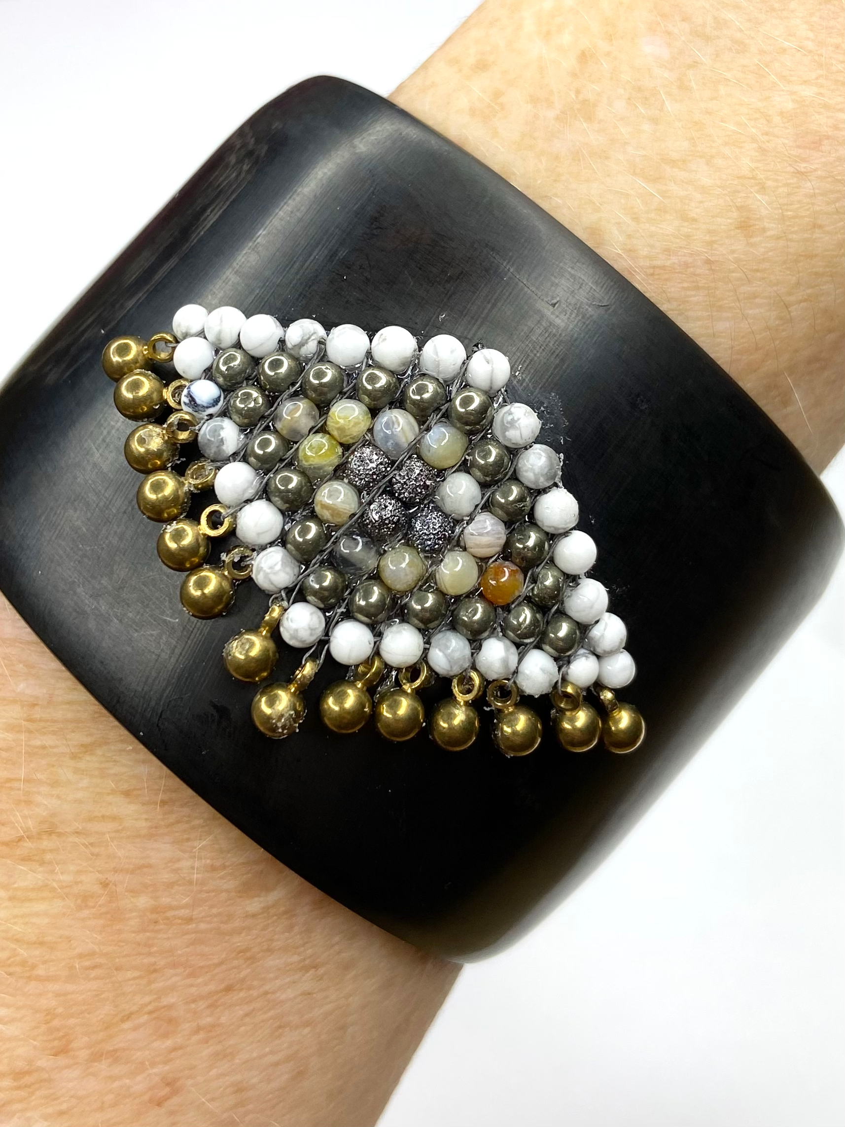 This amazing cuff fits the small to average wrist and features our signature hand woven beading in gunmetal, beige mother of pearl, pyrite and white howlite. The colors are both earthy and exquisite at once.