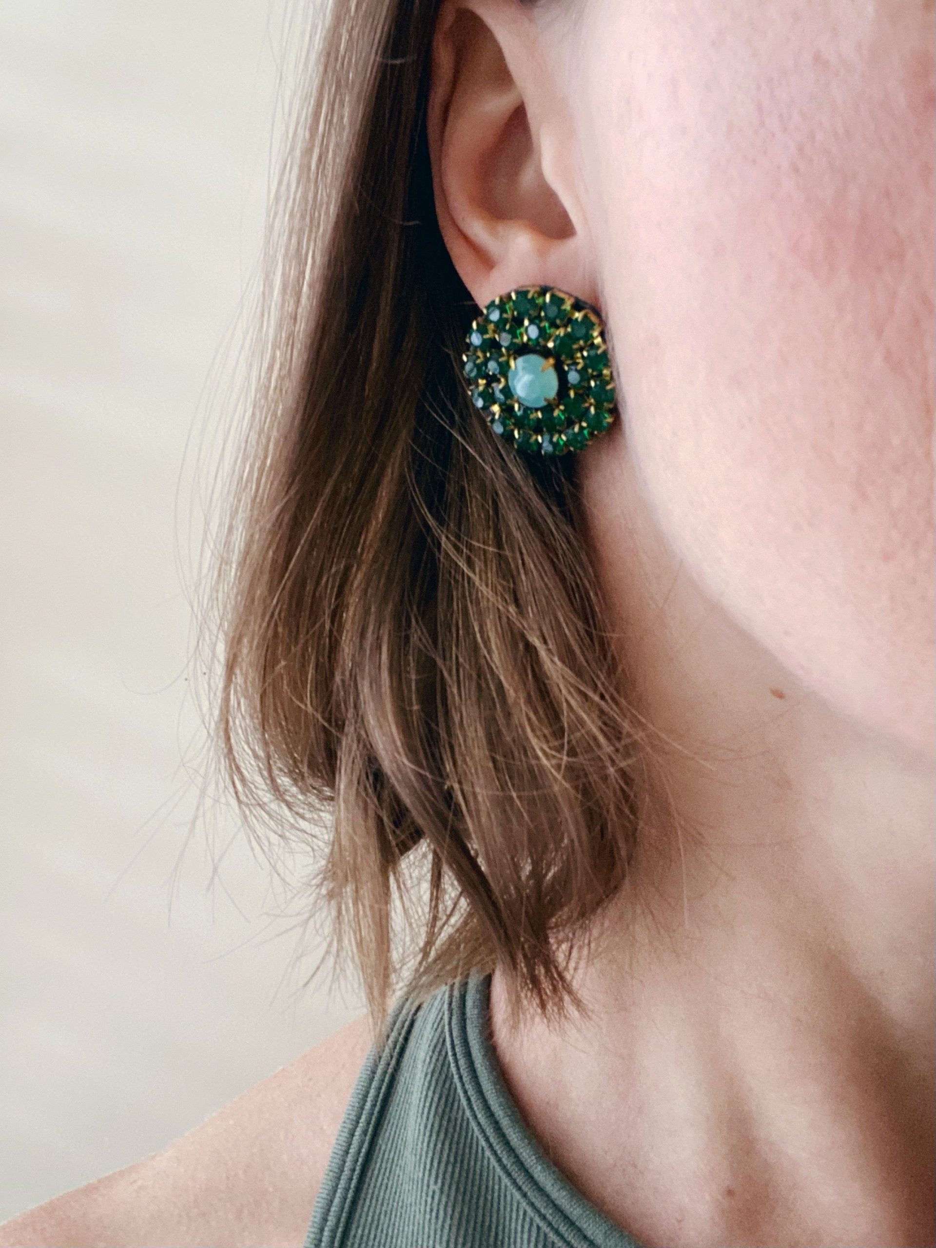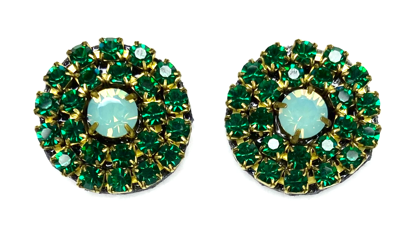 Emerald green rhinestones form a wreath around the turquoise centerpiece in these dazzling green rhinestone earrings. These gorgeous rhinestone studs are made of the finest Austrian crystals. Emerald green earrings are always a huge favorite.